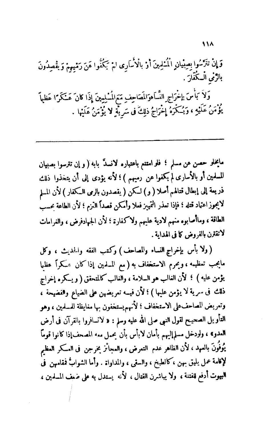 ولا بأس بإخراج النساء والمصاحف مع المسلمين إذا كان عسكراً عظيماً يؤمن عليه، ويكره إخراج ذلك في سريةٍ لا يؤمن عليها.