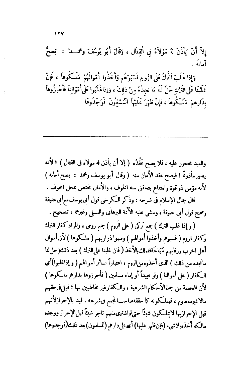 والعبد محجور عليه، فلا يصح عقده (إلا أن يأذن له مولاه في القتال) ؛ لأنه يصير مأذوناً؛ فيصح عقد الأمان منه (وقال أبو يوسف ومحمد: يصح أمانه) لأنه مؤمن ذو قوة وامتناع يتحقق منه الخوف، والأمان مختص بمحل الخوف.