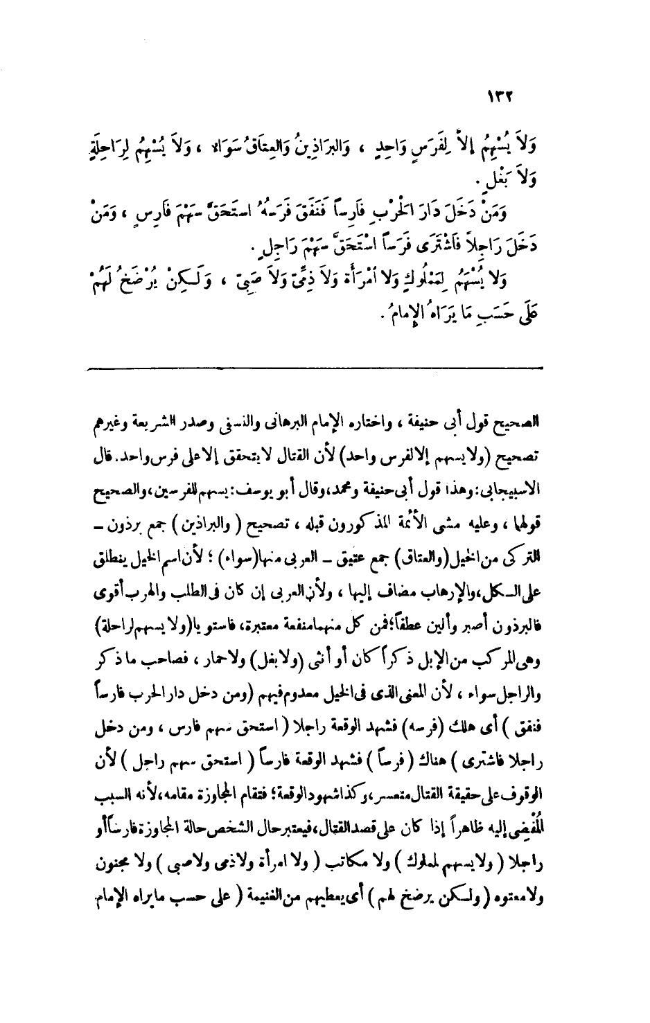 الصحيح قول أبي حنيفة، واختاره الإمام البرهاني والنسفي وصدر الشريعة وغيرهم تصحيح (ولا يسهم إلا لفرس واحد) لأن القتال لا يتحقق إلا على فرس واحد قال الإسبيجاني: هذا قول أبي حنيفة ومحمد، وقال أبو يوسف: يسهم للفرسين، والصحيح قولهما، وعليه مشى الأئمة المذكورون قبله، تصحيح (والبراذين) جمع برذون - التركي من الخيل (والعتاق) جمع عتيق - العربي منها (سواء) ؛ لأن اسم الخيل ينطلق على الكل، والإرهاب مضاف إليها، ولأن العربي إن كان في الطلب والهرب أقوى فالبرذون أصبر وألين عطفاً؛ فمن كل منهما منفعة معتبرة، فاستويا (ولا يسهم لراحلة) وهي المركب من الإبل ذكراً كان أو أنثى (ولا بغل) ولا حمار، فصاحب ما ذكر والراجل سواء، لأن المعنى الذي في الخيل معدوم فيهم (ومن دخل دار الحرب فارساً فنفق) أي هلك (فرسه) فشهد الوقعة راجلا (استحق سهم فارس، ومن دخل راجلا فاشترى) هناك (فرساً) فشهد الوقعة فارساً (استحق سهم راجل) لأن الوقوف على حقيقة القتال متعسر، وكذا شهود الوقعة؛ فتقام المجاوزة مقامه، لأنه السبب المفضي إليه ظاهراً إذا كان على قصد القتال، فيعتبر حال الشخص حالة المجاوزة فارساً أو راجلا (ولا يسهم لمملوك) ولا مكاتب (ولا امرأة ولا ذمي ولا صبي) ولا مجنون ولا معتوه (لكن يرضخ لهم) أي يعطيهم من الغنيمة (على حسب ما يراه الإمام)
