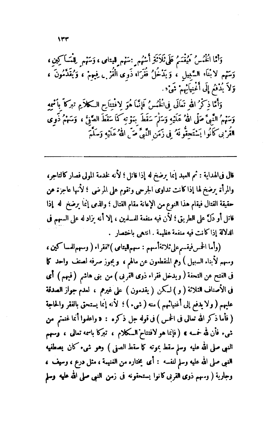 وأما الخمس فيقسم على ثلاثة أسهمٍ: سهمٍ لليتامى، وسهمٍ للمساكين، وسهم لأبناء السبيل، ويدخل فقراء ذوي القربى فيهم، ويقدمون، ولا يدفع إلى أغنيائهم شيء.