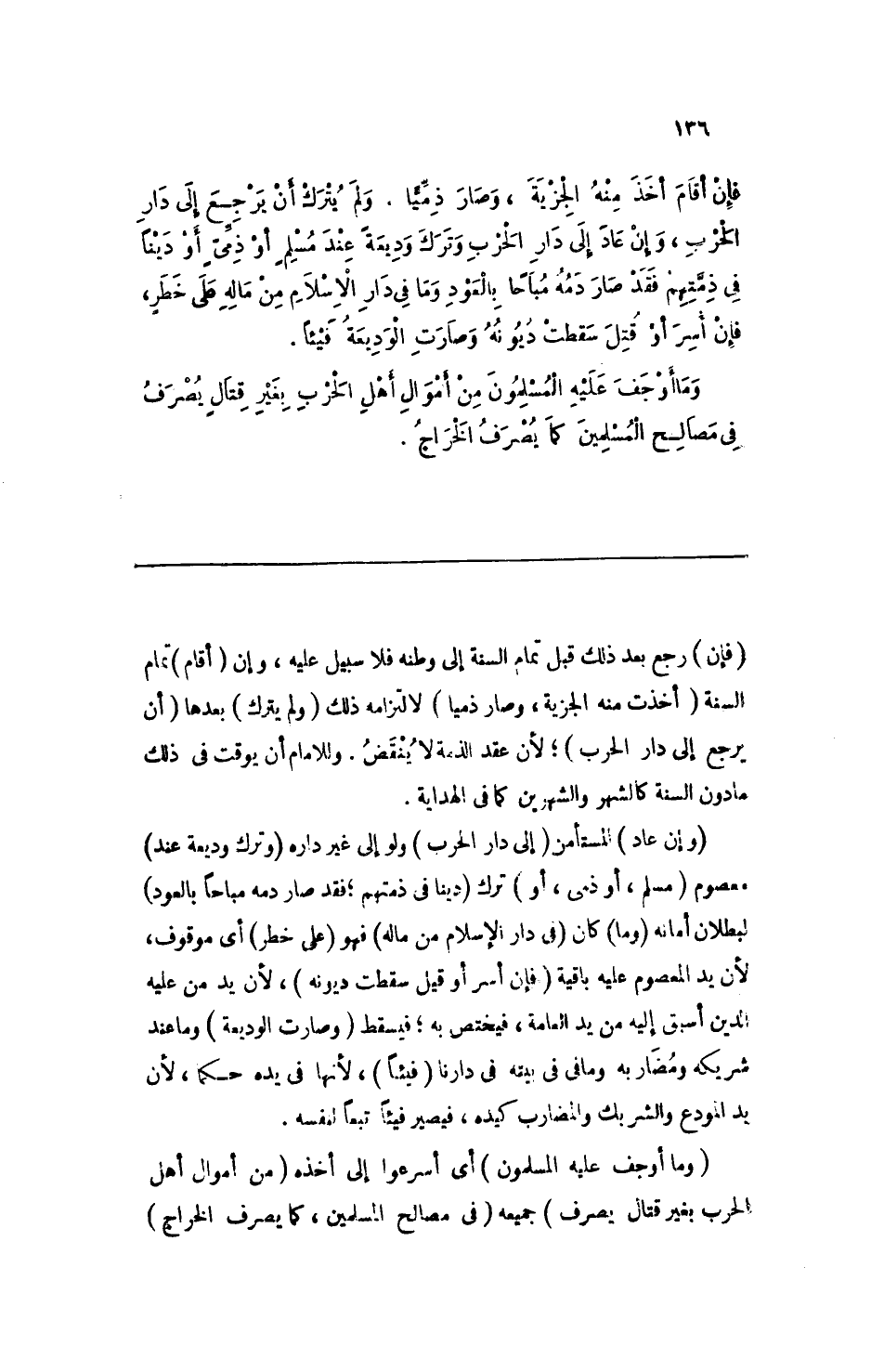 فإن أقام أخذ منه الجزية، وصار ذمياً. ولم يترك أن يرجع إلى دار الحرب، وإن عاد إلى دار الحرب وترك وديعةً عند مسلمٍ أو ذميٍ أو ديناً في ذمتهم فقد صار دمه مباحاً بالعود وما في دار الإسلام من ماله على خطرٍ، فإن أسو أو قتل سقطت ديونه وصارت الوديعة فيئاً.