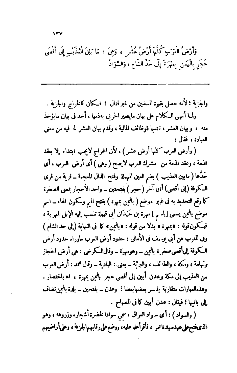 وأرض العرب كلها عشرٍ، وهي: ما بين العذيب إلى أقصى حجرٍ باليمن بمهرة إلى حد الشام، والسواد