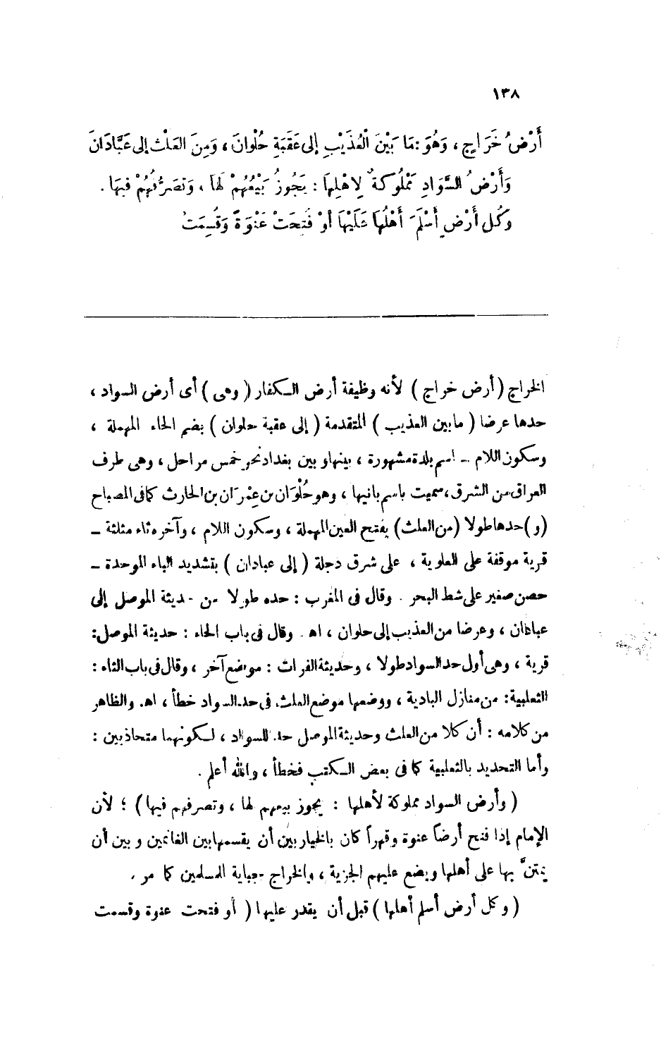 الخراج (أرض الخراج) لأنه وظيفة أرض الكفار (وهي) أي أرض السواد، حدها عرضا (ما بين العذيب) المتقدمة (إلى عقبة حلوان) بضم الحاء المهملة، وسكون اللام - اسم بلدة مشهورة، بينها وبين بغداد نحو خمس مراحل، وهي طرف العراق من الشرق، سميت باسم بانيها، وهو حلوان بن عمران بن الحارث كما في المصباح (و) حدها طولا (من العلث) بفتح العين المهملة، وسكون اللام، وآخره ثاء مثلثة - قرية موقفة على العلوية، على شرق دجلة (إلى عبادان) بتشديد الباء الموحدة - حصن صغير على شط البحر، وقال في المغرب: حده طولا من حديثة الموصل إلى عبادان، وعرضا من العذيب إلى حلوان، اهـ. وقال في باب الحاء: حديثة الموصل: قرية، وهي أول حد السواد طولا، وحديثة الفرات: موضع آخر، وقال في باب الثاء: الثعلبية: من منازل البادية، ووصعها موضع العلث في حد السواد خطأ، اهـ. والظاهر من كلامه: أن كلا من العلث وحديثة الموصل حد للسواد، لكونهما متحاذيين: وأما التحديد بالثعلبية كما في بعض الكتب فخطأ، والله أعلم.