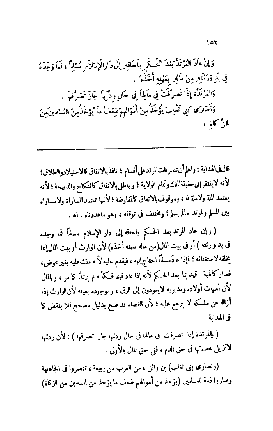 قال في الهداية: واعلم أن تصرفات المرتد على أقسام؛ نافذ بالاتفاق كالاستيلاد والطلاق؛ لأنه لا يفتقر إلى حقيقة الملك وتمام الولاية؛ وباطل بالاتفاق كالنكاح والذبيحة؛ لأنه يعتمد الملة ولا ملة له، وموقوف بالاتفاق كالمفاوضة؛ لأنها تعتمد المساواة ولا مساواة بين المسلم والمرتد ما لم يسلم؛ ومختلف في توقفه، وهو ما عددناه. اهـ.