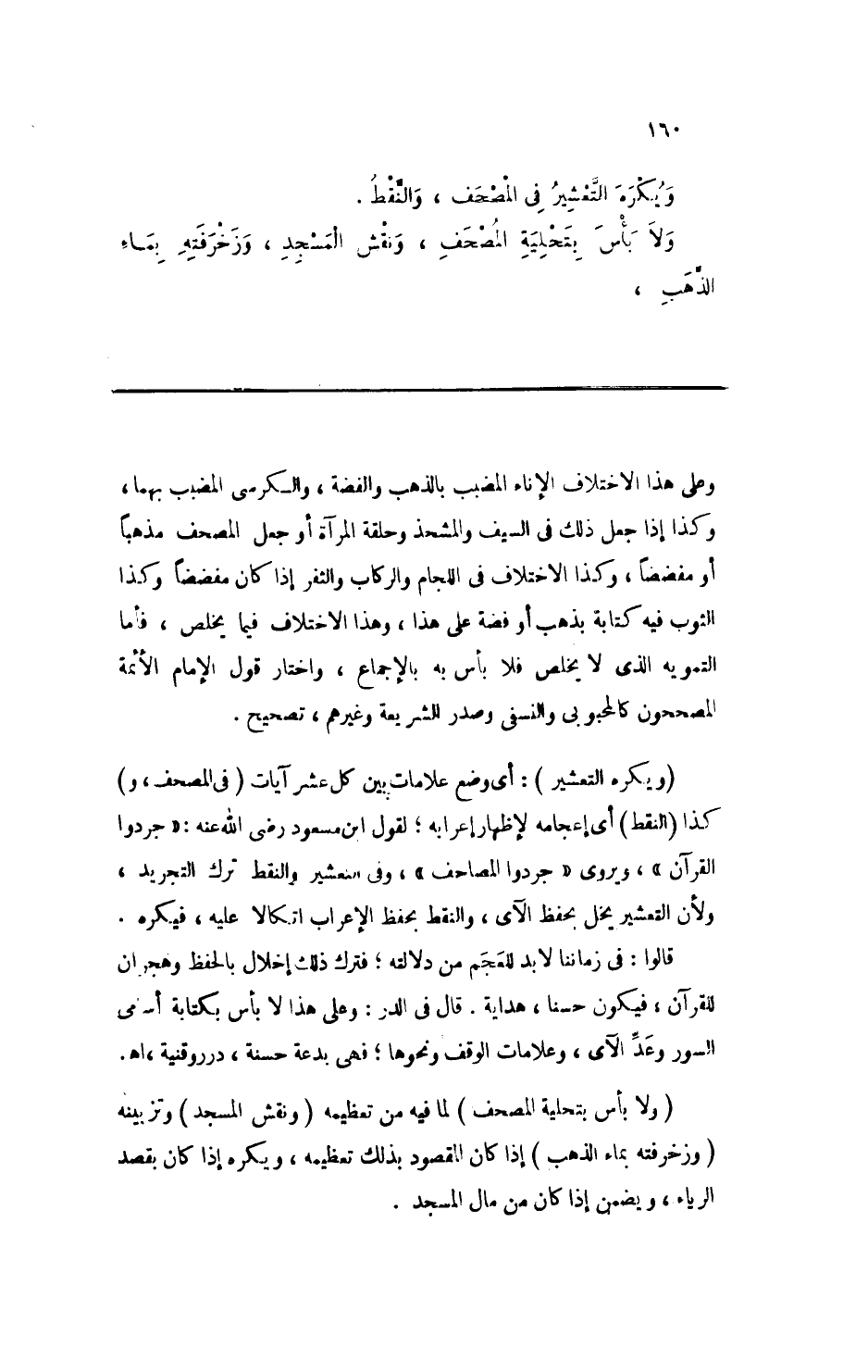 (ولا بأس يتحلية المصحف) لما فيه من تعظيمه (ونقش المسجد) وتزيينه (وزخرفته بماء الذهب) إذا كان المقصود بذلك تعظيمه، ويكره إذا كان بقصد الرياء، ويضمن إذا كان من مال المسجد