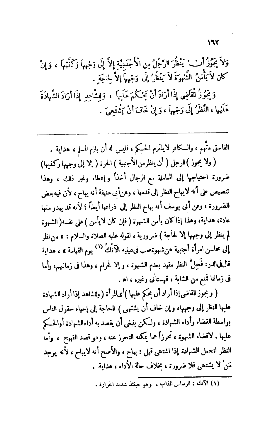 (ويجوز للقاضي إذا أراد أن يحكم عليها) أي المرأة (وللشاهد إذا أراد الشهادة عليها النظر إلى وجهها، وإن خاف أن يشتهي) للحاجة إلى إحياء حقوق الناس بواسطة القضاء وأداء الشهادة، ولكن ينبغي أن يقصد به أداء الشهادة أو الحكم عليها، لا قضاء الشهوة، تحرزاً عما يمكنه التحرز عنه، وهو قصد القبيح، وأما النظر لتحمل الشهادة إذا اشتهى قيل: يباح، والأصح أنه لا يباح، لأنه يوجد من لا يشتهي فلا ضرورة، بخلاف حالة الأداء، هداية