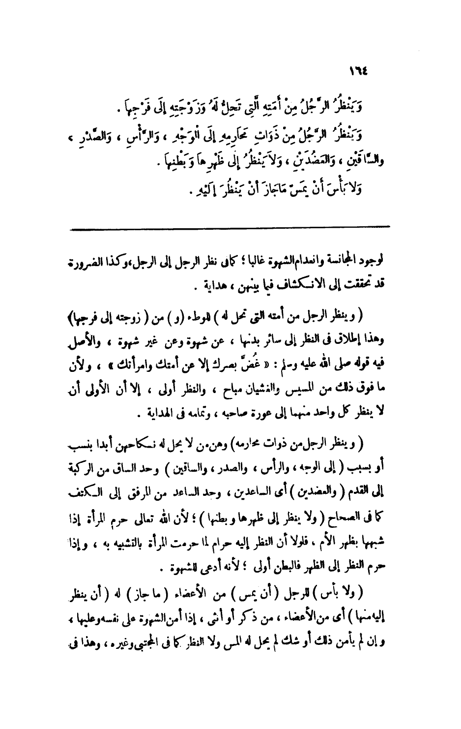 وينظر الرجل من ذوات محارمه إلى الوجه، والرأس، والصدر، والساقين، والعضدين، ولا ينظر إلى ظهرها وبطنها.