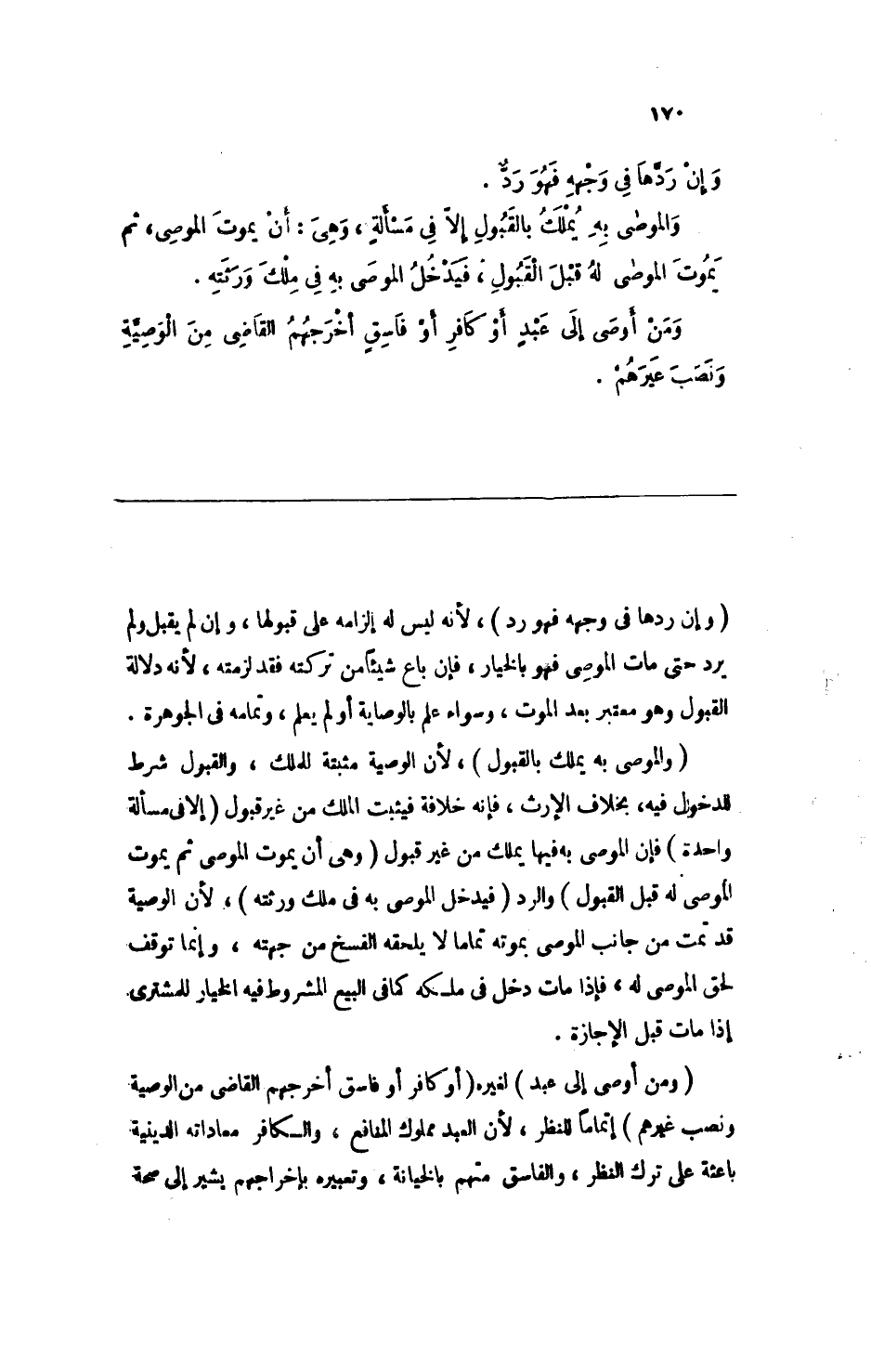 (والموصى به يملك بالقبول) ، لأن الوصية مثبته للملك، والقبول شرط للدخول فيه؛ بخلاف الإرث، فإنه خلافة فيثبت الملك من غير قبول (إلا في مسألة واحدة) فإن الموصى به فيها يملك من غير قبول (وهي أن يموت الموصي ثم يموت الموصى له قبل القبول) والرد (فيدخل الموصى به في ملك ورثته) ، لأن الوصية قد تمت من جانب الموصى بموته تماما لا يلحقه الفسخ من جهته، وإنما توقف لحق الموصى له، فإذا مات دخل في ملكه كما في البيع المشروط فيه الخيار للمشتري إذا مات قبل الإجازة.
