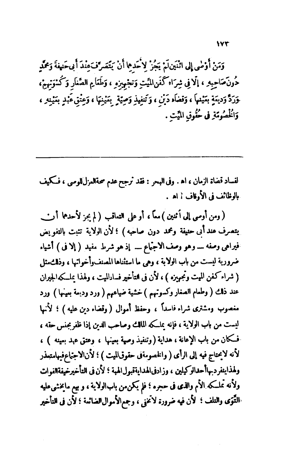 ومن أوصى إلى اثنين لم يجز لأحدهما أن يتصرف عند أبي حنيفة ومحمدٍ دون صاحبه، إلا في شراء كفن الميت وتجهيزه، وطعام الصغار وكسوتهم، ورد وديعةٍ بعينها، وقضاء دين، وتنفيذ وصيةٍ بعينها، وعتق عبدٍ بعينه، والخصومة في حقوق الميت.