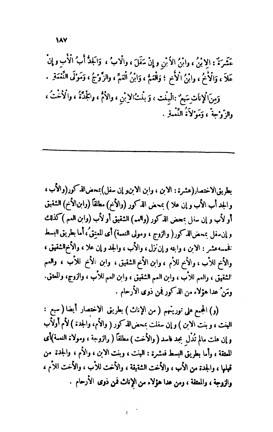 بطريق الاختصار (عشرة: الابن، وابن الابن وإن سفل) بمحض الذكور (والأب، والجد أب الأب وإن علا) بمحض الذكور (والأخ) مطلقاً (وابن الأخ) الشقيق أو الأب وإن سفل بمحض الذكور (والعم) الشقيق أو لأب (وابن العم) كذلك وإن سفل بمحض الذكور (والزوج، ومولى النعمة) أي المعتق، أما بطريق البسط فخمسة عشر: الابن، وابنه وإن نزل، والأب، والجد وإن علا، والأخ الشقيق، والأخ للأب، والأخ للأم، وابن الأخ الشقيق، وابن الأخ للأب، والعم الشقيق، والعم للأب، وابن العم الشقيق، وابن العم للأب، والزوج، والمعتق. ومن عدا هؤلاء من الذكور فمن ذوي الأرحام.
