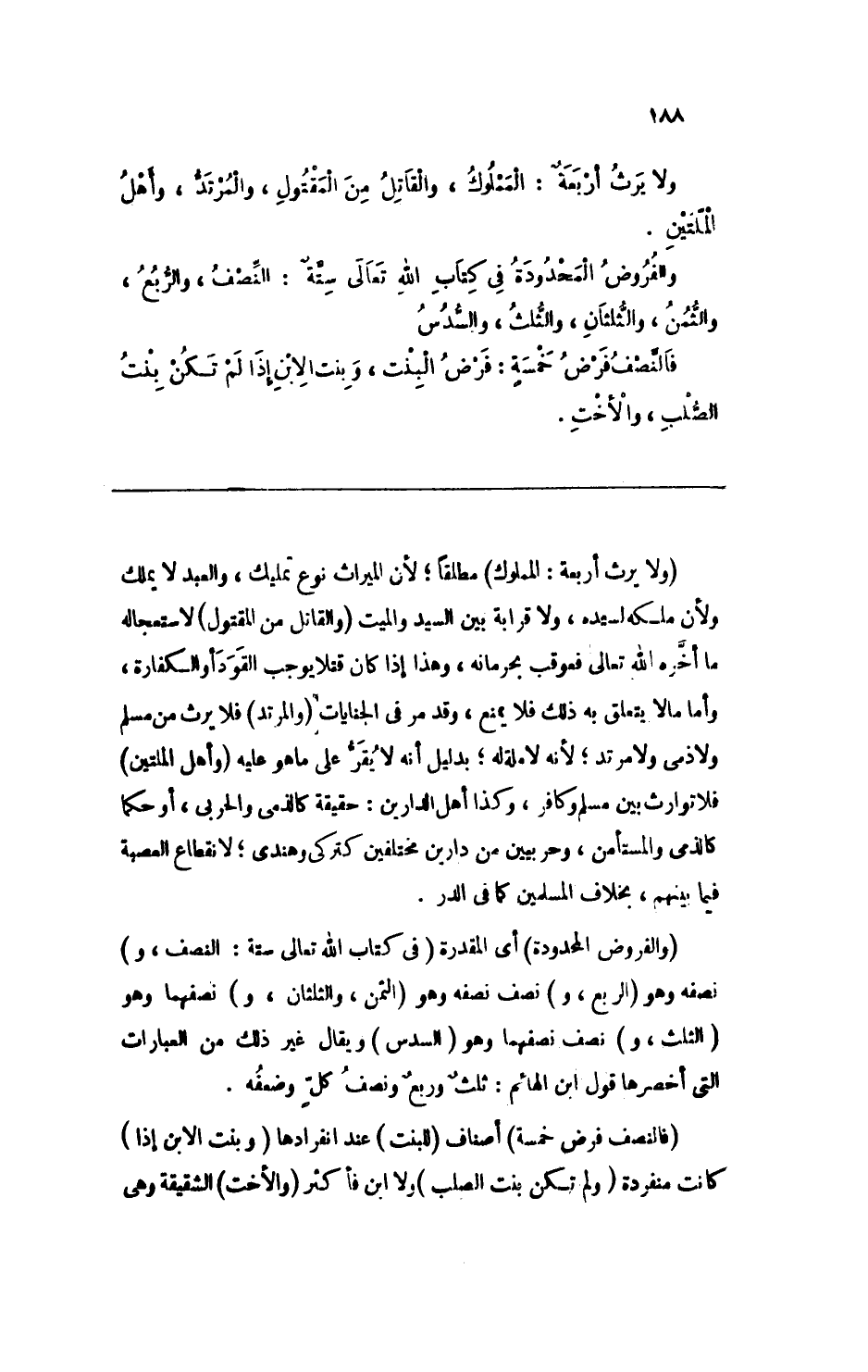 (ولا يرث أربعة: المملوك) مطلقاً؛ لأن الميراث نوع تمليك، والعبد لا يملك ولأن ملكه لسيده، ولا قرابة بين السيد والميت (والقاتل من المقتول) لاستعجاله ما أخره الله تعالى فعوقب بحرمانه، وهذا إذا كان قتلا يوجب القود أو الكفارة، وأما ما لا يتعلق به ذلك فلا يمنع، وقد مر في الجنايات (والمرتد) فلا يرث من مسلم ولا ذمي ولا مرتد؛ لأنه لا ملة له؛ بدليل أنه لا يقر على ما هو عليه (وأهل الملتين) فلا توارث بين مسلم وكافر، وكذا أهل الدارين: حقيقة كالذمي والحربي، أو حكما كالذمي والمستأمن، وحربيين من دارين مختلفين كتركي وهندي؛ لانقطاع العصبة فيما بينهم، بخلاف المسلمين كما في الدر.