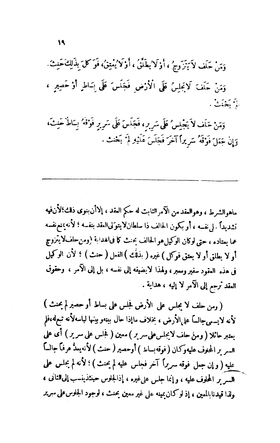 (ومن حلف لا يجلس على الأرض فجلس على بساط أو حصير لم يحنث) لأنه لا يسمى جالساً على الأرض، بخلاف ما إذا حال بينه وبينها لباسه لأنه تبع له، فلم يعتبر حائلا (ومن حلف لا يجلس على سرير) معين (فجلس على سرير) أي على السرير المحلوف عليه وكان (فوقه بساط) أو حصير (حنث) لأنه يعد عرفاً جالساً عليه (وإن جعل فوقه سريراً آخر فجلس عليه لم يحنث) ؛ لأنه لم يجلس على السرير المحلوف عليه، وإنما جلس على غيره، إذ لجلوس حينئذ ينسب إلى الثاني، ولذا قيدنا بالمعين، إذ لو كان يمينه على غير معين يحنث، لوجود الجلوس على سرير