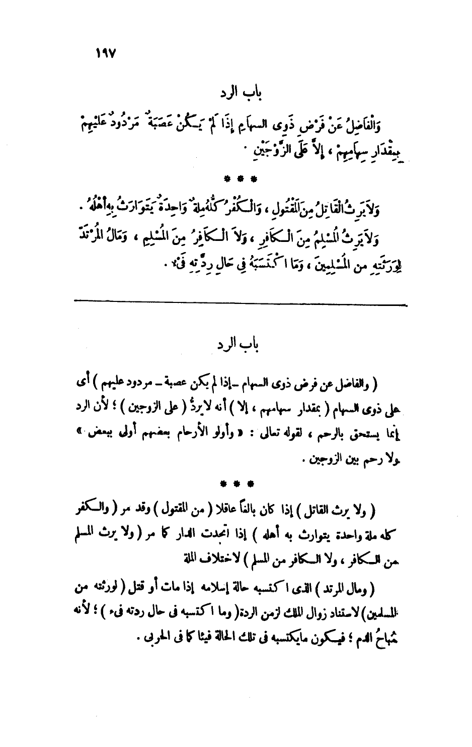 (والفاضل عن فرض ذوي السهام - إذا لم يكن عصبة - مردود عليهم) أي على ذوي السهام (بمقدار سهامهم، إلا) أنه لا يرد (على الزوجين) ؛ لأن الرد إنما يستحق بالرحم، لقوله تعالى: {وأولو الأرحام بعضهم أولى ببعض} ولا رحم بين الزوجين.