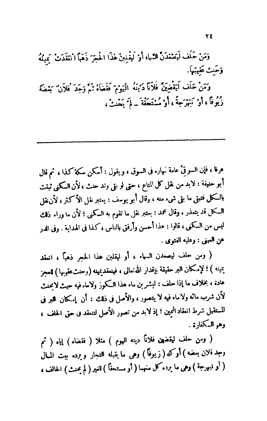 عرفا، فإن السوقي عامة النهار في السوق، ويقول: أسكن سكة كذا، ثم قال أبو حنيفة: لابد من نقل كل المتاع، حتى لو بقي وتد حنث، لأن السكنى ثبتت بالكل فتبقى ما بقي شيء منه، وقال أبو يوسف: يعتبر نقل الأكثر، لأن نقل الكل قد يتعذر، وقال محمد: يعتبر نقل ما تقوم به السكنى؛ لأن ما وراء ذلك ليس من السكنى، قالوا: هذا أحسن وأرفق بالناس، كذا في الهداية. وفي الدر عن العيني: وعليه الفتوى.