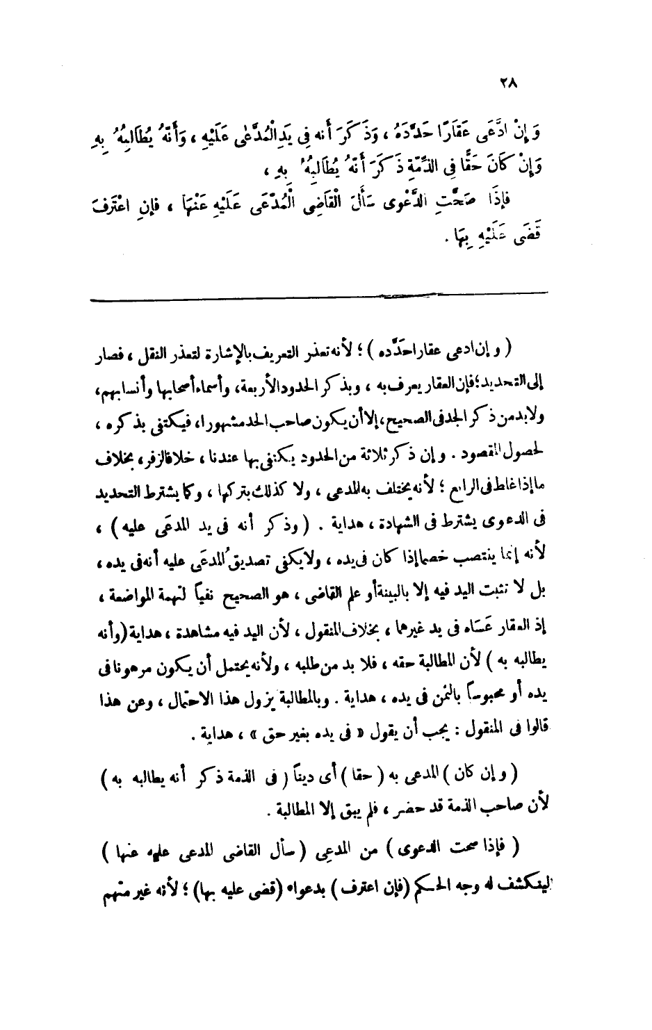 (وإن ادعى عقاراً حدده) ؛ لأنه تعذر التعريف بالإشارة لتعذر النقل، فصار إلى التحديد؛ فإن العقار يعرف به، ويذكر الحدود الأربعة، وأسماء أصحابها وأنسابهم، ولابد من ذكر الجد في التصحيح، إلا أن يكون صاحب الحد مشهورا، فيكتفي بذكره، لحصول المقصود. وإن ذكر ثلاثة من الحدود يكتفي بها عندنا، خلافا لزفر، بخلاف ما إذا غلط في الرابع؛ لأنه يختلف به المدعي، ولا كذلك بتركها، وكما يشترط التحديد في الدعوى يشترط في الشهادة، هداية. (وذكر أنه في يد المدعى عليه) ، لأنه إنما ينتصب خصما إذا كان في يده، ولا يكفي تصديق المدعى عليه