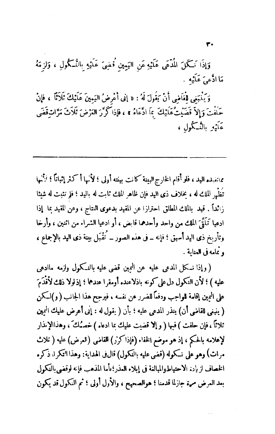 (وإذا نكل المدعى عليه عن اليمين قضى عليه بالنكول ولزمه ما ادعى عليه) ؛ لأن النكول دل على كونه باذلا عنده أو مقرا عندهما؛ إذ لولا ذلك لأقدم على اليمين إقامة للواجب ودفعاً للضرر عن نفسه، فيرجح هذا الجانب (و) لكن (ينبغي للقاضي أن) ينذر المدعى عليه؛ بأن (يقول له: إني أعرض عليك اليمين ثلاثاً، فإن حلفت) فيها (وإلا قضيت عليك بما ادعاه) خصمك، وهذا الإنذار لإعلامه بالحكم، إذ هو موضع الخفاء (فإذا كرر) القاضي (العرض) عليه (ثلاث مرات) وهو على نكوله (قضى عليه بالنكول) قال في الهداية: وهذا التكرار ذكره الخصاف لزيادة الاحتياط والمبالغة في إبلاء العذر؛ فأما المذهب فإنه لو قضى بالنكول بعد العرض مرة جاز لما قدمنا؛ هو الصحيح، والأول أولى؛ ثم النكول قد يكون
