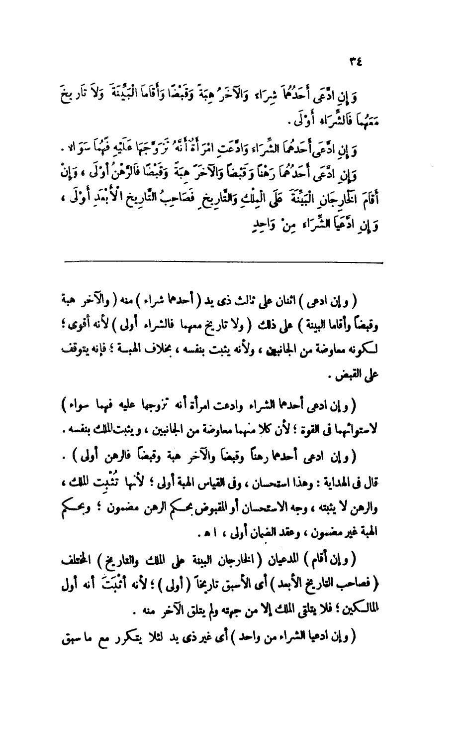 وإن ادعى أحدهما رهناً وقبضاً والآخر هبةً وقبضاً فالرهن أولى، وإن أقام الخارجان البينة على الملك والتاريخ فصاحب التاريخ الأبعد أولى، وإن ادعيا الشراء من واحدٍ
