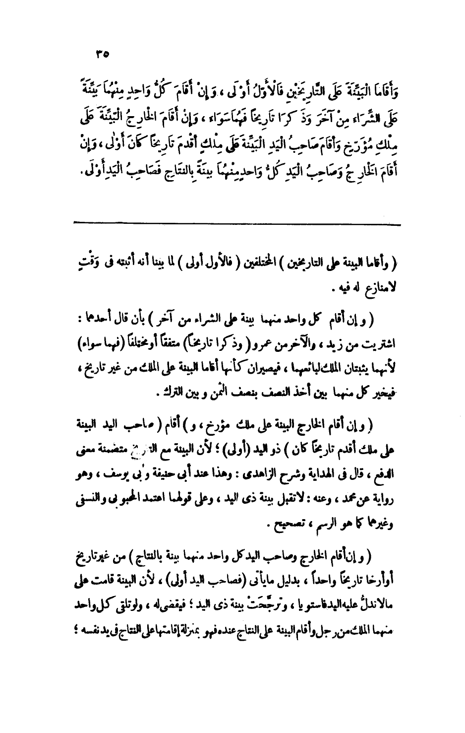 وأقاما البينة على التاريخين فالأول أولى، وإن أقام كل واحدٍ منهما بينةً على الشراء من آخر وذكرا تاريخاً فهما سواء، وإن أقام الخارج البينة على ملكٍ مؤرخٍ وأقام صاحب اليد البينة على ملكٍ أقدم تاريخاً كان أولى، وإن أقام الخارج وصاحب اليد كل واحدٍ منهما بينةً بالنتاج فصاحب اليد أولى.