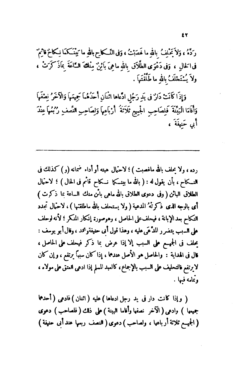 وإذا كانت دارٌ في يد رجلٍ ادعاها اثنان أحدهما جميعها والآخر نصفها وأقاما البينة فلصاحب الجميع ثلاثة أرباعها ولصاحب النصف ربعها عند أبي حنيفة،
