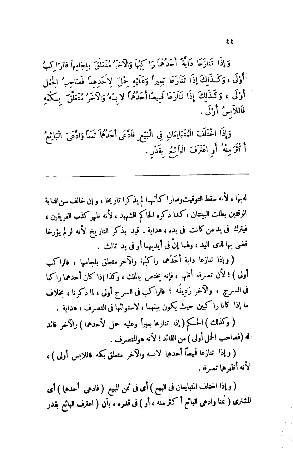 (وإذا تنازعا دابة أحدهما راكبها والآخر متعلق بلجامها، فالراكب أولى) ؛ لأن تصرفه أظهر، فإنه يختص بالملك، وكذا إذا كان أحدهما راكبا في السرج، والآخر رديفه؛ فالراكب في السرج أولى، لما ذكرنا، بخلاف ما إذا كانا راكبين حيث يكون بينهما، لاستوائهما في التصرف، هداية.