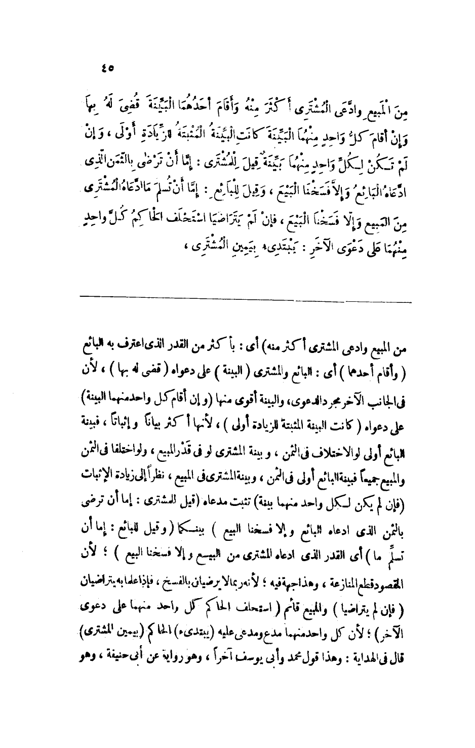 من المبيع وادعى المشتري أكثر منه) أي: بأكثر من القدر الذي اعترف به البائع (وأقام أحدهما) أي: البائع والمشتري (البينة) على دعواه (قضى له بها) ، لأن في الجانب الآخر مجرد الدعوى، والبينة أقوى منها (وإن أقام كل واحد منهما البينة) على دعواه (كانت البينة المثبتة للزيادة أولى) ، لأنها أكثر بياناً وإثباتاً، فبينة البائع أولى لو الاختلاف في الثمن، وبينة المشتري لو في قدر المبيع، ولو اختلفا في الثمن والمبيع جميعاً فبينة البائع أولى في الثمن، وبينة المشتري في المبيع، نظراً إلى زيادة الإثبات (فإن لم يكن لكل واحد منهما بينة) تثبت مدعاه (قيل للمشتري: إما أن ترضى بالثمن الذي ادعاه البائع وإلا فسخنا البيع) بينكما (وقيل للبائع: إما أن تسلم ما) أي القدر الذي ادعاه المشتري من البيع وإلا فسخنا البيع) ؛ لأن المقصود قطع المنازعة، وهذا جهة فيه؛ لأنه ربما لا يرضيان بالفسخ، فإذا علما به يتراضيان (فإن لم يتراضيا) والمبيع قائم (استحلف الحاكم كل واحد منهما على دعوى الآخر) ؛ لأن كل واحد منهما مدع ومدعى عليه (يبتدئ) الحاكم (بيمين المشتري) قال في الهداية: وهذا قول محمد وأبي يوسف آخراً، وهو رواية عن أبي حنيفة، وهو