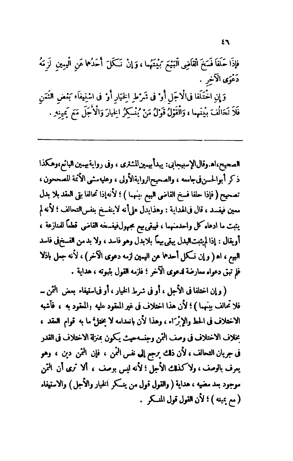 الصحيح، اهـ. وقال الإسبيجاني: يبدأ بيمين المشتري، وفي رواية بيمين البائع، وهكذا ذكر أبو الحسن في جامعه، والصحيح الرواية الأولى، وعليه مشى الأئمة المصححون، تصحيح (فإذا حلفا فسخ القاضي البيع بينهما) ؛ لأنه إذا تحالفا بقي العقد بلا بدل معين فيفسد، قال في الهداية: وهذا يدل على أنه لا ينفسخ بنفس التحالف؛ لأنه لم يثبت ما ادعاه كل واحد منهما، فيبقى بيع مجهول فيفسخه القاضي قطعاً للمنازعة، أو يقال: إذا لم يثبت البدل يبقى بيعاً بلا بدل وهو فاسد، ولابد من الفسخ في فاسد البيع، اهـ (وإن نكل أحدهما عن اليمين لزمه دعوى الآخر) ، لأنه جعل باذلا فلم تبق دعواه معارضة لدعوى الاخر؛ فلزمه القول بثبوته، هداية.
