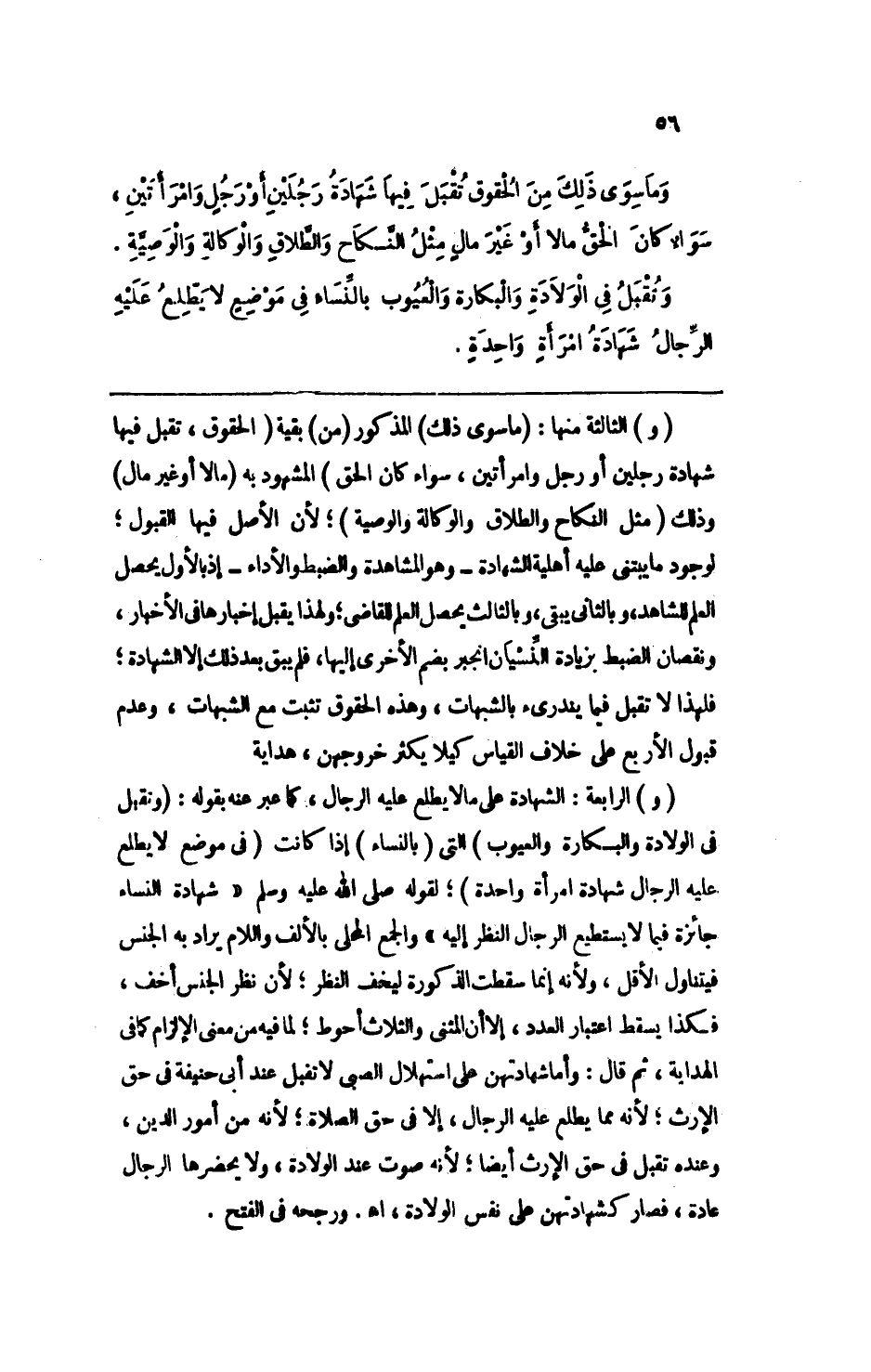 وتقبل في الولادة والبكارة والعيوب بالنساء في موضعٍ لا يطلع عليه الرجال شهادة امرأةٍ واحدةٍ.
