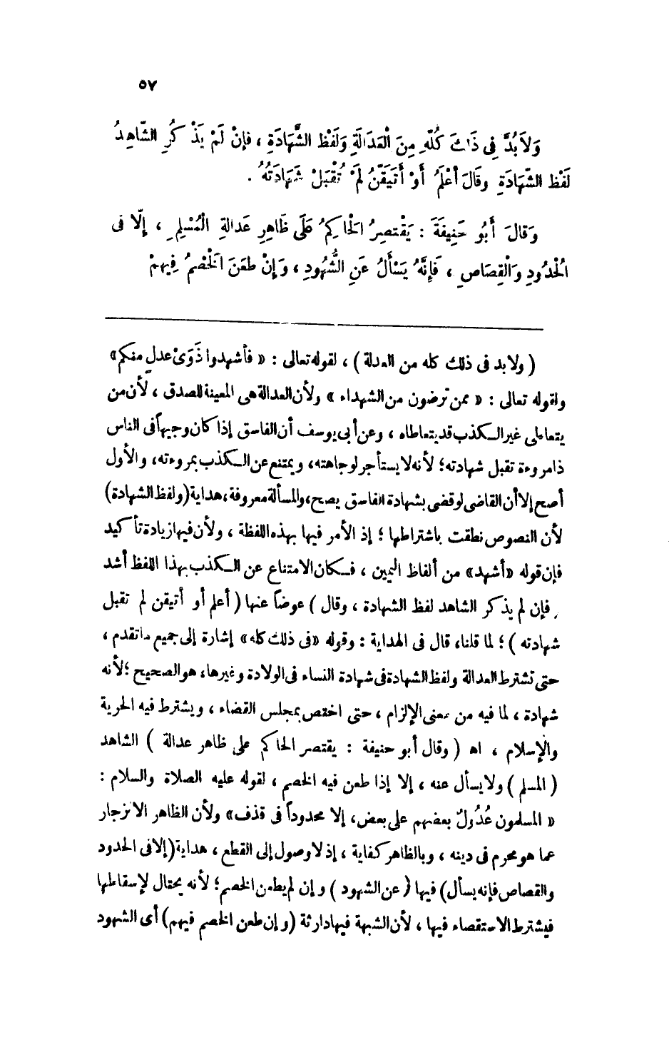 (ولابد في ذلك كله من العدالة) ، لقوله تعالى: {فأشهدوا ذوي عدلٍ منكم} ولقوله تعالى: {ممن ترضون من الشهداء} ولأن العدالة هي المعينة للصدق، لأن من يتعاطى غير الكذب قد يتعاطاه، وعن أبي يوسف أن الفاسق إذا كان وجيهاً في الناس ذا مروءة تقبل شهادته؛ لأنه لا يستأجر لوجاهته، ويمتنع عن الكذب بمروءته، والأول أصح إلا أن القاضي لو قضى بشهادة الفاسق يصح، والمسألة معروفة، هداية (ولفظ الشهادة) لأن النصوص نطقت باشتراطها؛ إذ الأمر بهذه اللفظة، ولأن فيها زيادة تأكيد فإن قوله "أشهد" من ألفاظ اليمين، فكان الامتناع عن الكذب بهذا اللفظ أشد (فإن لم يذكر الشاهد لفظ الشهادة، وقال) عوضاً عنها (أعلم أو أتيقن لم تقبل شهادته) ؛ لما قلنا، قال في الهداية: وقوله "في ذلك كله" إشارة إلى جميع ما تقدم، حتى تشترط العدالة ولفظ الشهادة في شهادة النساء في الولادة وغيرها، هو الصحيح؛ لأنه شهادة، لما فيه من معنى الإلزام، حتى اختص بمجلس القضاء، ويشترط فيه الحرية والإسلام، اهـ.