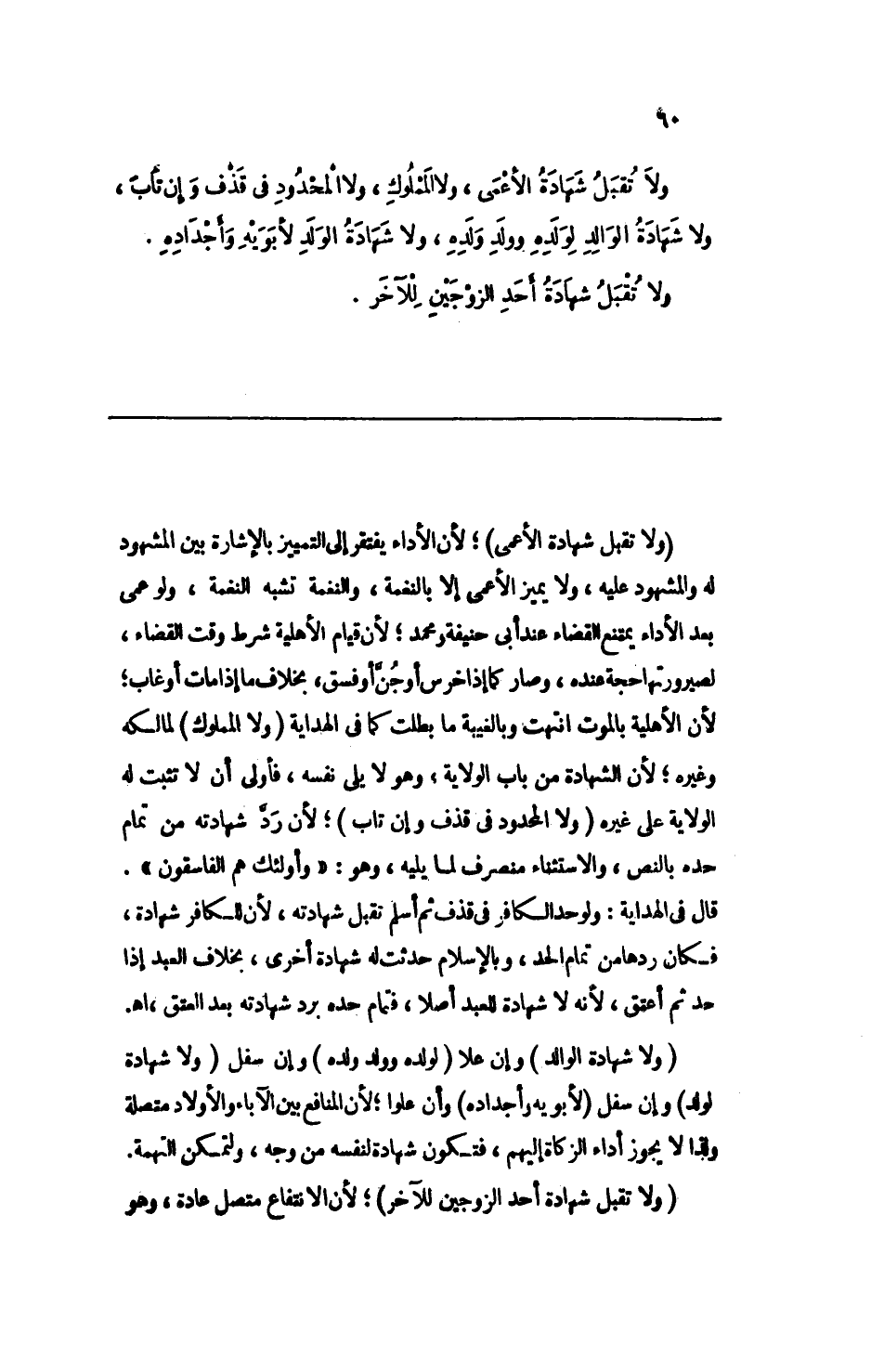 ولا تقبل شهادة الأعمى، ولا المملوك، ولا المحدود في قذف وإن تاب، ولا شهادة الوالد لولده وولد ولده، ولا شهادة الولد لأبويه وأجداده.