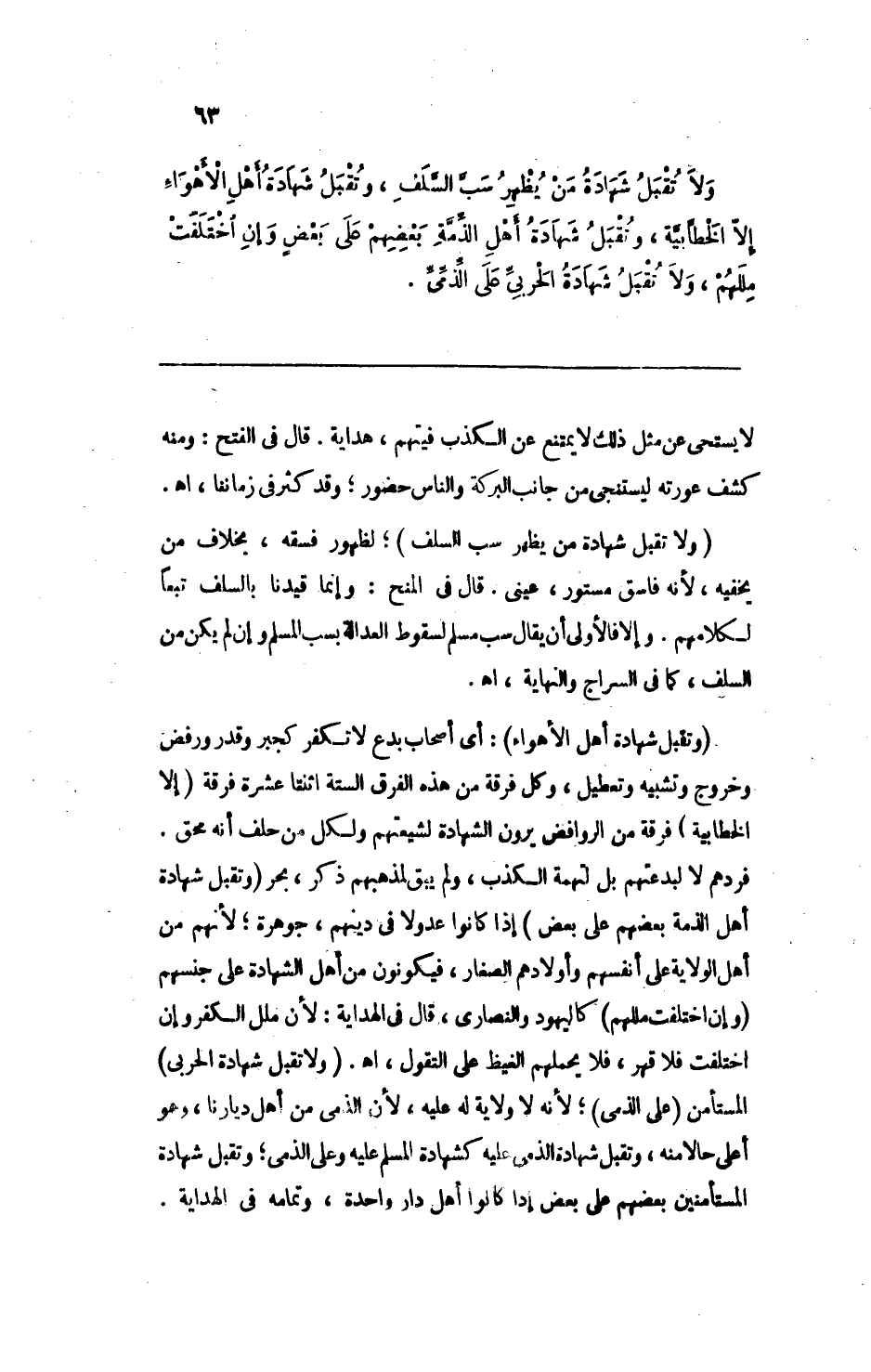ولا تقبل شهادة من يظهر سب السلف، وتقبل شهادة أهل الأهواء إلا الخطابية، وتقبل شهادة أهل الذمة بعضهم على بعضٍ وإن اختلفت مللهم، ولا تقبل شهادة الحربي على الذمي.