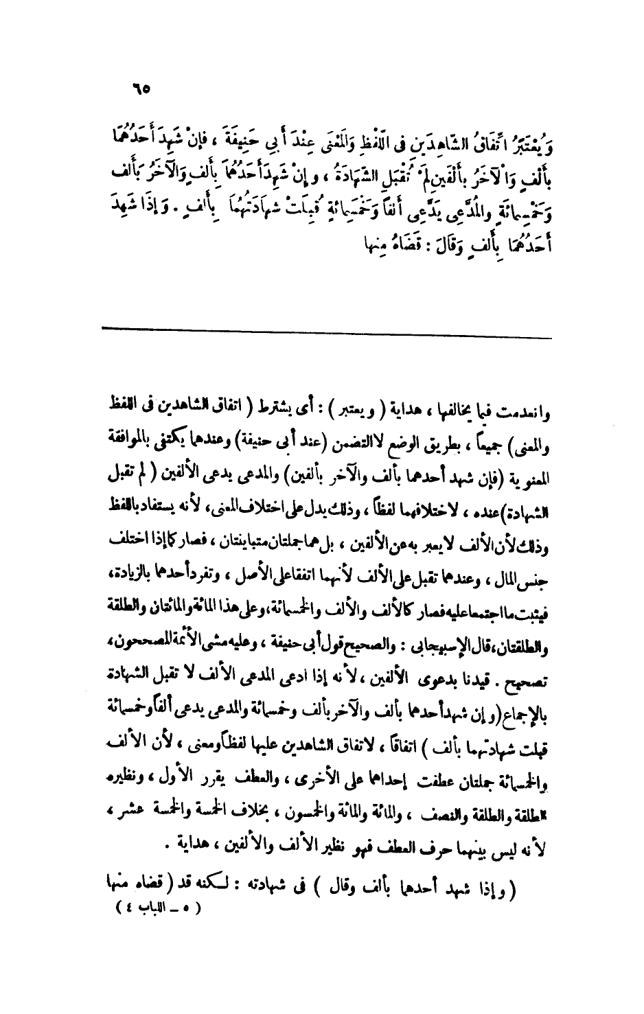 ويعتبر اتفاق الشاهدين في اللفظ والمعنى عند أبي حنيفة، فإن شهد أحدهما بألفٍ والآخر بألفين لم تقبل الشهادة، وإن شهد أحدهما بألفٍ والآخر بألف وخمسمائةٍ والمدعي يدعي ألفاً وخمسمائةٍ قبلت شهادتهما بألفٍ. وإذا شهد أحدهما بألفٍ وقال: قضاه منها