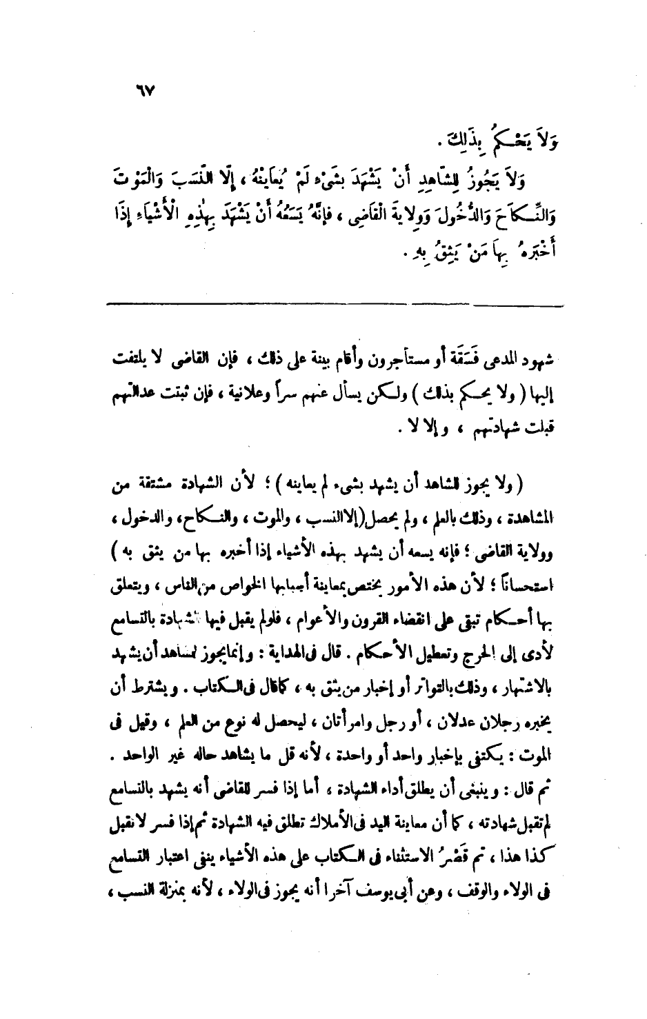 ولا يجوز للشاهد أن يشهد بشيءٍ لم يعاينه، إلا النسب والموت والنكاح والدخول وولاية القاضي، فإنه يسعه أن يشهد بهذه الأشياء إذا أخبره بها من يثق به.
