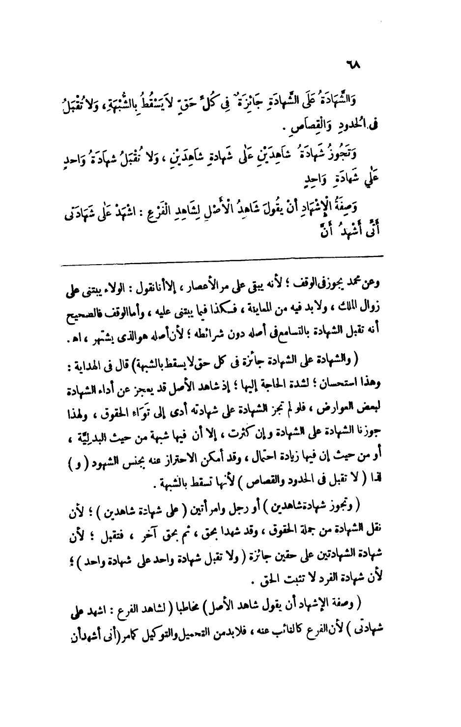 والشهادة على الشهادة جائزةٌ في كل حقٍ لا يسقط بالشبهة، ولا تقبل في الحدود والقصاص.