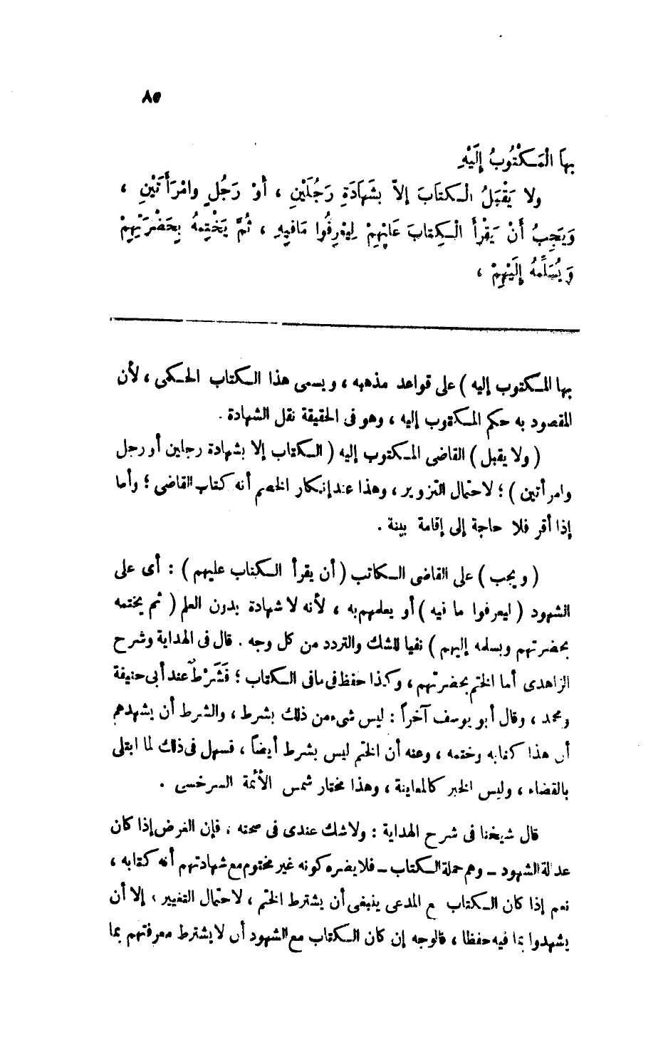 ولا يقبل الكتاب إلا بشهادة رجلين، أو رجلٍ وامرأتين، ويجب أن يقرأ الكتاب عليهم ليعرفوا ما فيه، ثم يختمه بحضرتهم ويسلمه إليهم،