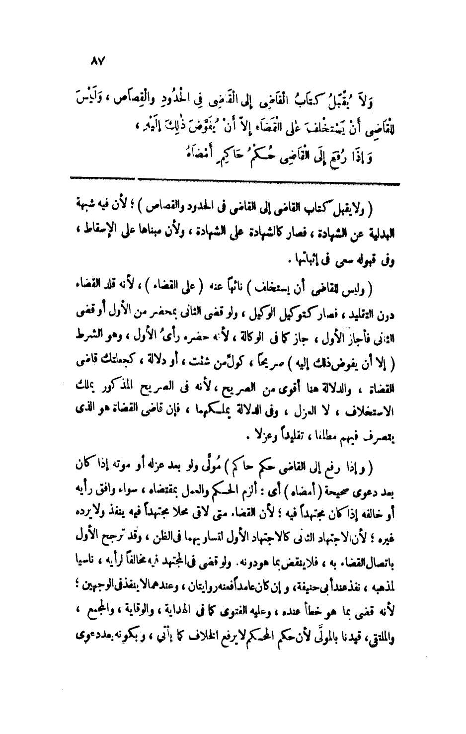 ولا يقبل كتاب القاضي إلى القاضي في الحدود والقصاص، وليس للقاضي أن يستخلف على القضاء إلا أن يفوض ذلك إليه،