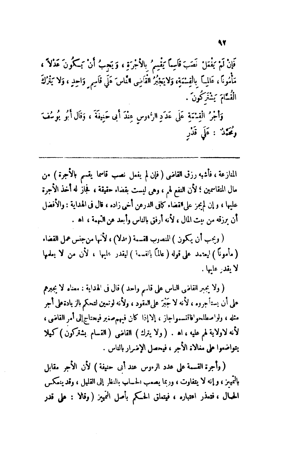 وأجر القسمة على عدد الرءوس عند أبي حنيفة، وقال أبو يوسف ومحمدٌ: على قدر