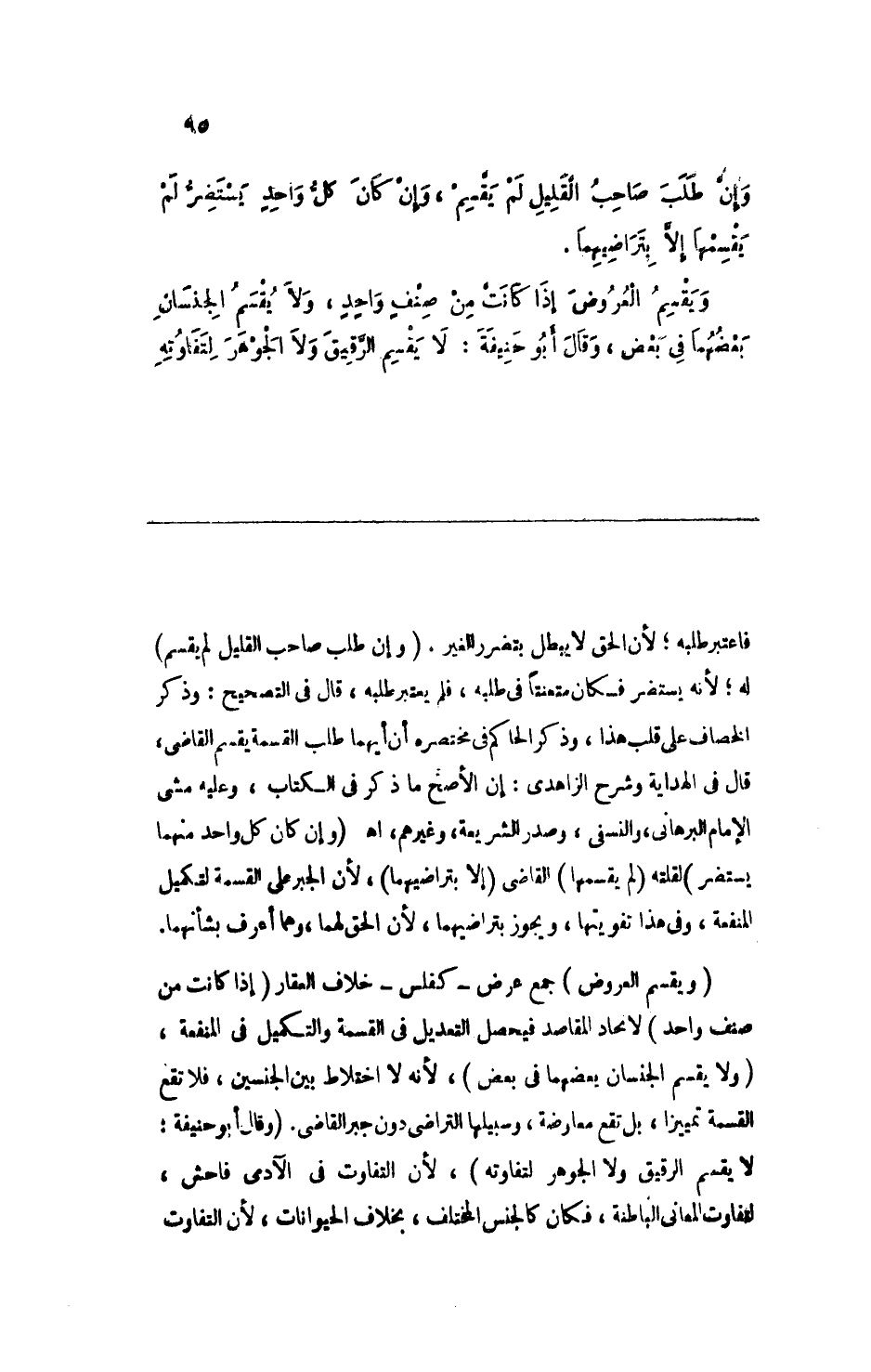 ويقسم العروض إذا كانت من صنفٍ واحدٍ، ولا يقسم الجنسان بعضهما في بعض، وقال أبو حنيفة: لا يقسم الرقيق ولا الجوهر لتفاوته