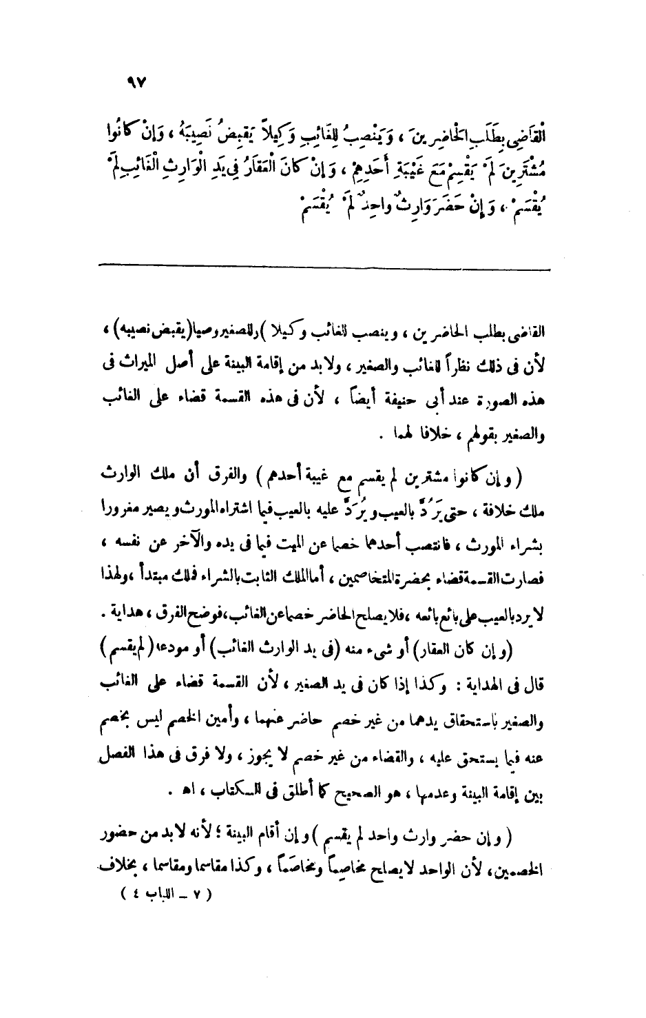 القاضي بطلب الحاضرين، وينصب للغائب وكيلا) وللصغير وصيا (يقبض نصيبه) ، لأن في ذلك نظراً للغائب والصغير، ولابد من إقامة البينة على أصل الميراث في هذه الصورة عند أبي حنيفة أيضاً، لأن في هذه القسمة قضاء على الغائب والصغير بقولهم، خلافا لهما.