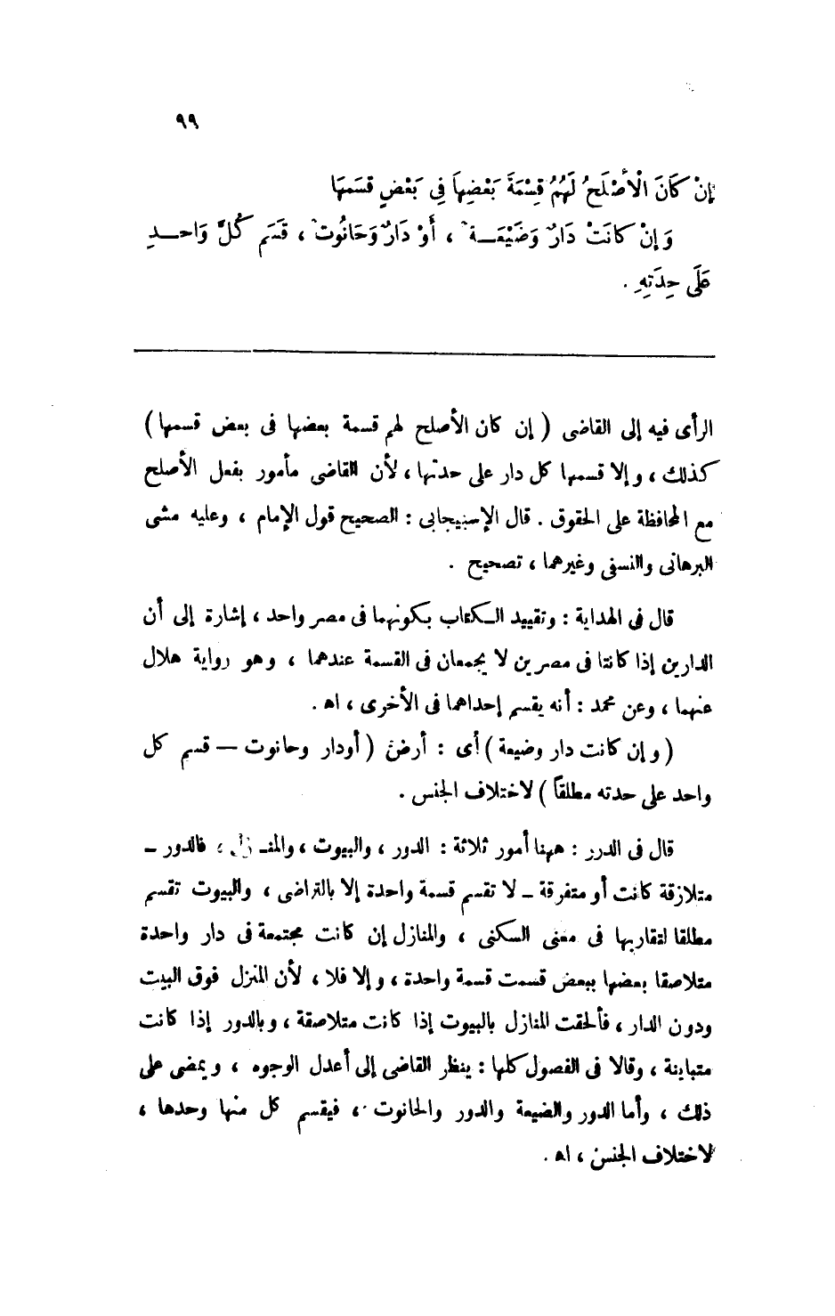 قال في الدرر: ههنا أمور ثلاثة: الدور، والبيوت، والمنازل، فالدور - متلازقة كانت أو متفرقة - لا تقسم قسمة واحدة إلا بالتراضي، والبيوت تقسم مطلقا لتقاربها في معنى السكنى، والمنازل إن كانت مجتمعة في دار واحدة متلاصقة بعضها ببعض قسمت قسمة واحدة، وإلا فلا، لأن المنزل فوق البيت ودون الدار، فألحقت المنازل بالبيوت إذا كانت متلاصقة، وبالدور إذا كانت متباينة، وقالا في الفصول كلها: ينظر القاضي إلى أعدل الوجوه، ويمضي على ذلك، وأما الدور والضيعة والدور والحانوت، فيقسم كل منها وحدها، لاختلاف الجنس، اه