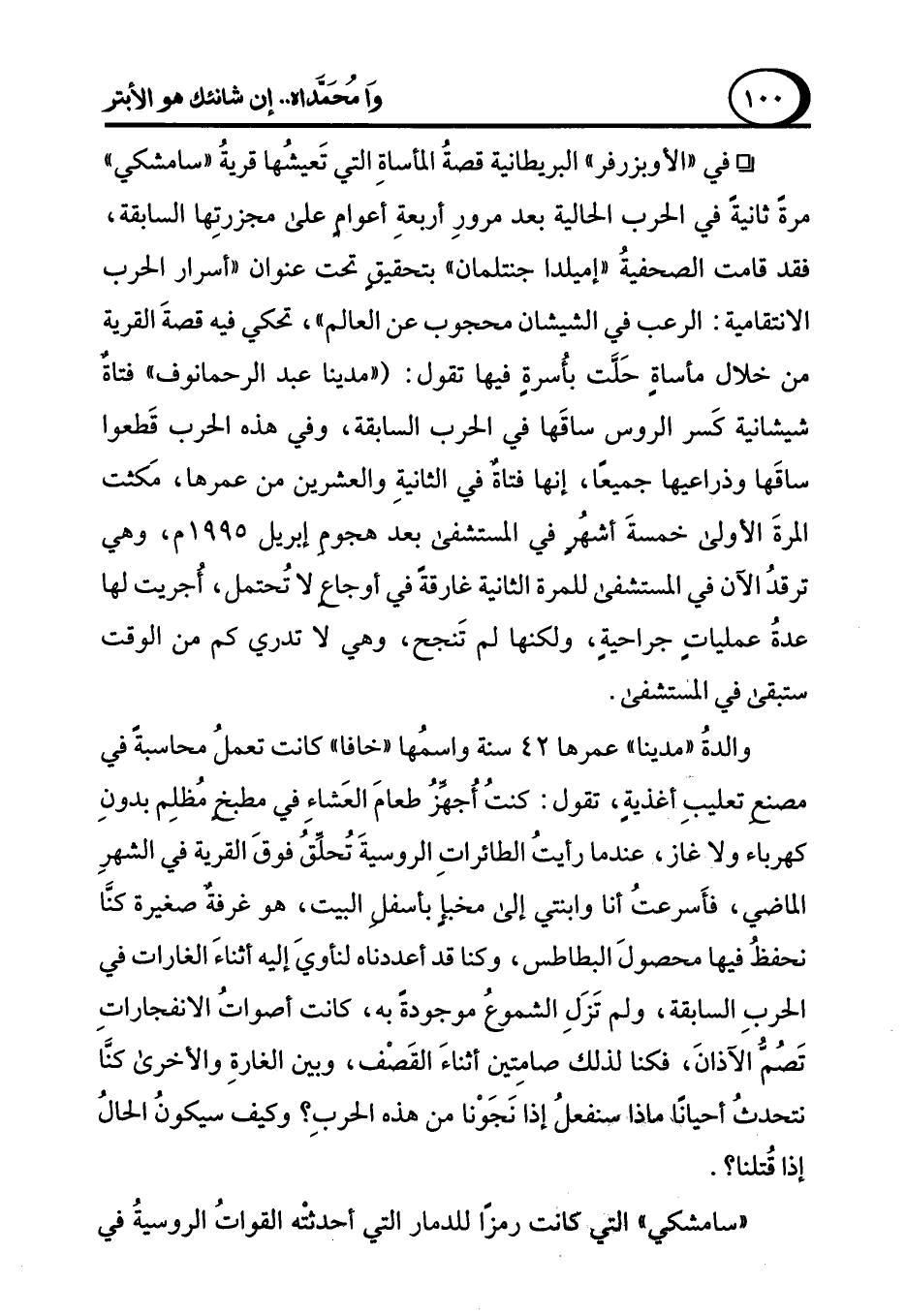 ° في "الأوبزرفر" البريطانية قصةُ المأساةِ التي تَعيشُها قريةُ "سامشكي" مرةً ثانيةً في الحرب الحالية بعد مرورِ أربعةِ أعوامٍ على مجزرتِها السابقة، فقد قامت الصحفية" إميلدا جنتلمان" بتحقيق تحت عنوان "أسرار الحرب الانتقامية: الرعب في الشيشان محجوب عن العالم"، تحكي فيه قصةَ القرية من خلال مأساةٍ حَلَّت بأسرةٍ فيها تقول: ("مدينا عبد الرحمانوف" فتاةٌ شيشانية كَسر الروس ساقَها في الحرب السابقة، وفي هذه الحرب قَطعوا ساقَها وذراعيها جميعًا، إنها فتاة في الثانيةِ والعشرين من عمرها، مَكثت المرةَ الأولى خمسةَ أشهُر في المستشفى بعد هجوم إبريل 1995 م، وهي ترقدُ الآن في المستشفى للمرة الثانية غارقةً في أوجاع لا تُحتمل، أجريت لها عدةُ عملياتٍ جراحيةٍ، ولكنها لم تَنجح، وهي لا تدري كم من الوقت ستبقى في المستشفى.
