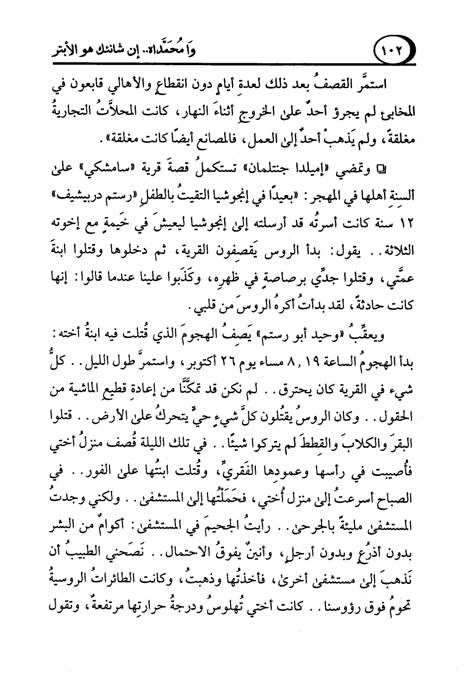 ويعقِّبُ "وحيد أبو رستم" يَصِف الهجومَ الذي قُتلت فيه ابنةُ أخته: بدأ الهجوم الساعة 8.19 مساء يوم 26 أكتوبر، واستمرَّ طول الليل .. كل شيء في القرية كان يحترق .. لم نكن قد تمكَنَّا من إعادةِ قطيع الماشية من الحقول .. وكان الروس ُيقتُلون كلَّ شيءٍ حيّ يتحرك على الأرض .. قتلوا البقرَ والكلابَ والقِططَ لم يتركوا شيئًا .. في تلك الليلة قُصف منزلُ أختي فأُصيبت في رأسها وعمودِها الفَقري، وقُتلت ابنتها على الفور .. في الصباح أسرعت إلى منزل أُختي، فحَمَلتها إلى المستشفى .. ولكني وجدتُ المستشفئ مليئةً بالجرحى .. رأيتُ الجحيمَ في المستشفى: أكوامٌ من البشر بدون أذرعٍ وبدون أرجل، وأنينٌ يفوقُ الاحتمال .. نَصَحني الطبيب أن نَذهبَ إلى مستشفى أخرى، فأخذتُها وذهبُ، وكانت الطائراتُ الروسية تحومُ فوق رؤوسنا .. كانت أختي تهلوسُ ودرجة حرارتِها مرتفعةٌ، وتقول
