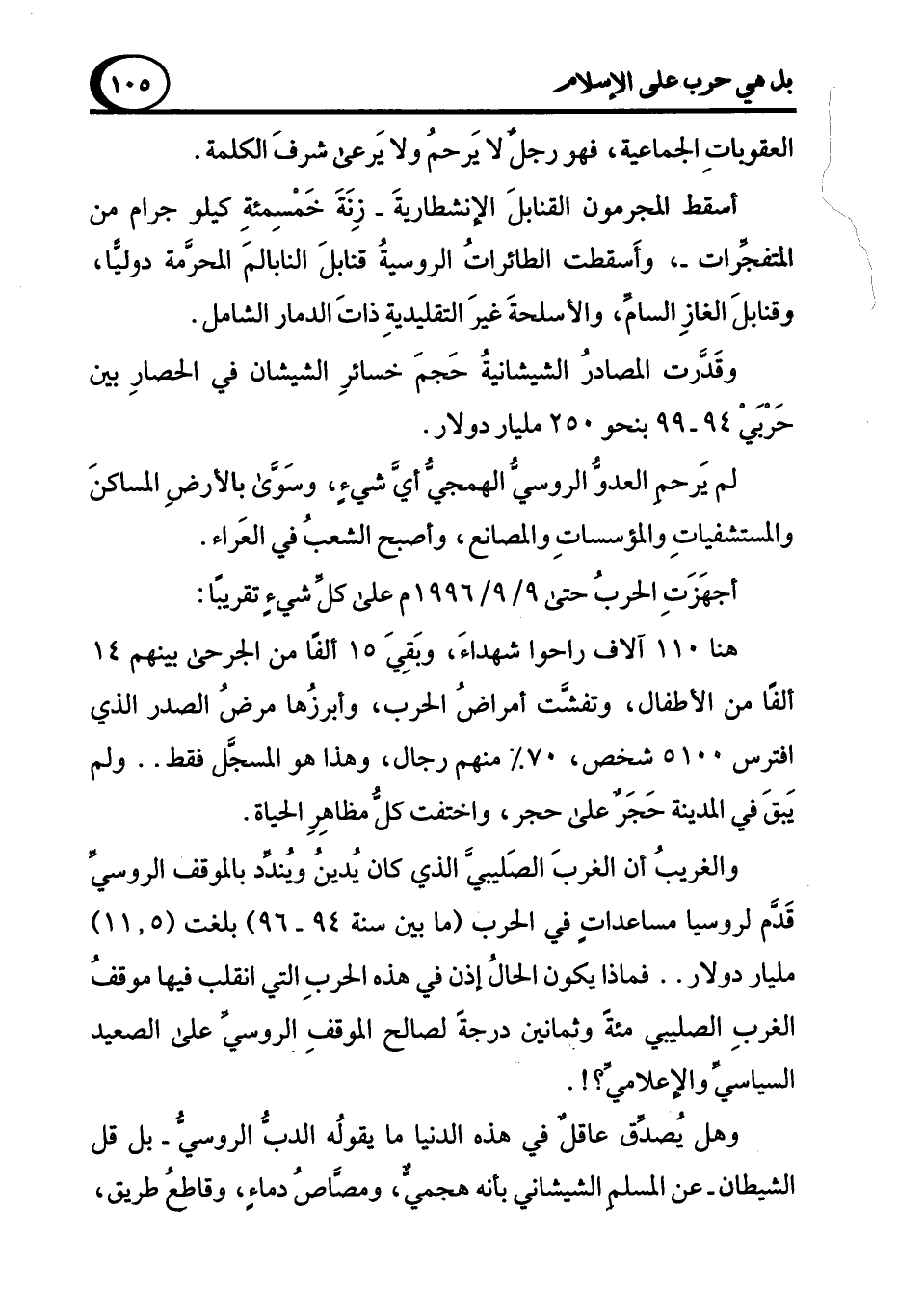وهل يُصدق عاقل في هذه الدنيا ما يقولُه الدبُّ الروسيُ -بل قل الشيطان- عن المسلم الشيشاني بأنه هجمي، ومصاصُ دماءِ، وقاطعُ طريق،
