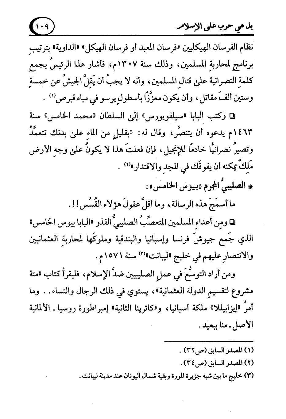 ° ومِن أعداءِ المسلمين المتعصبُ الصليبي القذر "البابا بيوس الخامس" الذي جَمع جيوشَ فرنسا وإسبانيا والبندقية وملوكَها لمحاربةِ العثمانيين والانتصارِ عليهم في خليج "ليبانت" (¬3) سنة 1571 م.