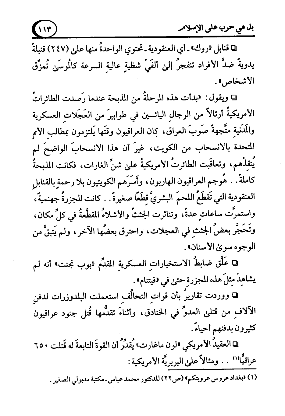 ° العقيدُ الأمريكي "لون ماغارت" يُقدِّرُ أن القوةَ التابعةَ له قَتلت 650 عراقيًا (¬1) .. ومثالاً على البربريَّة الأمريكية: