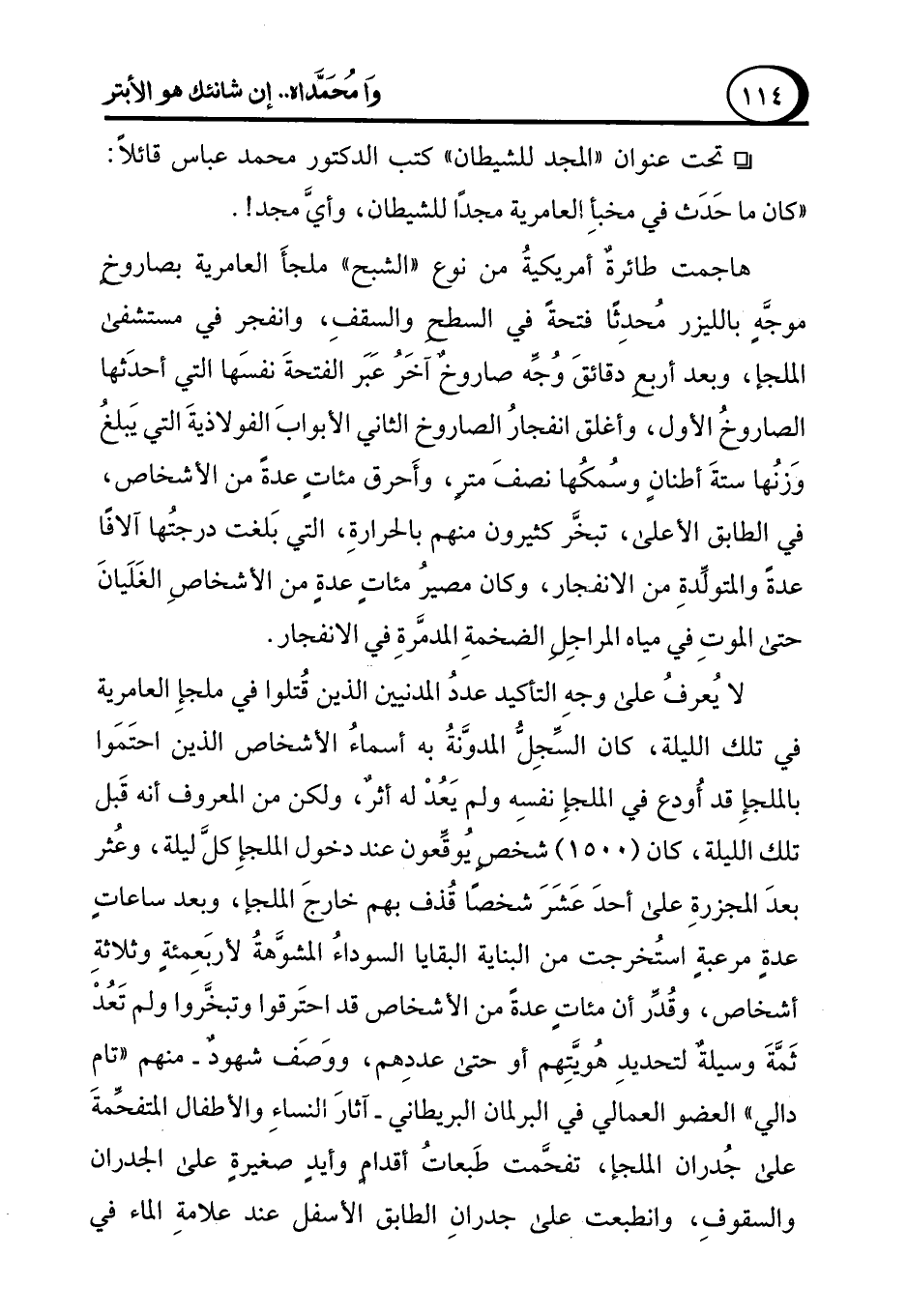 ° تحت عنوان "المجد للشيطان" كتب الدكتور محمد عباس قائلاً: "كان ما حَدَث في مخبأِ إلعامرية مجدًا للشيطان، وأيَّ مجد!.