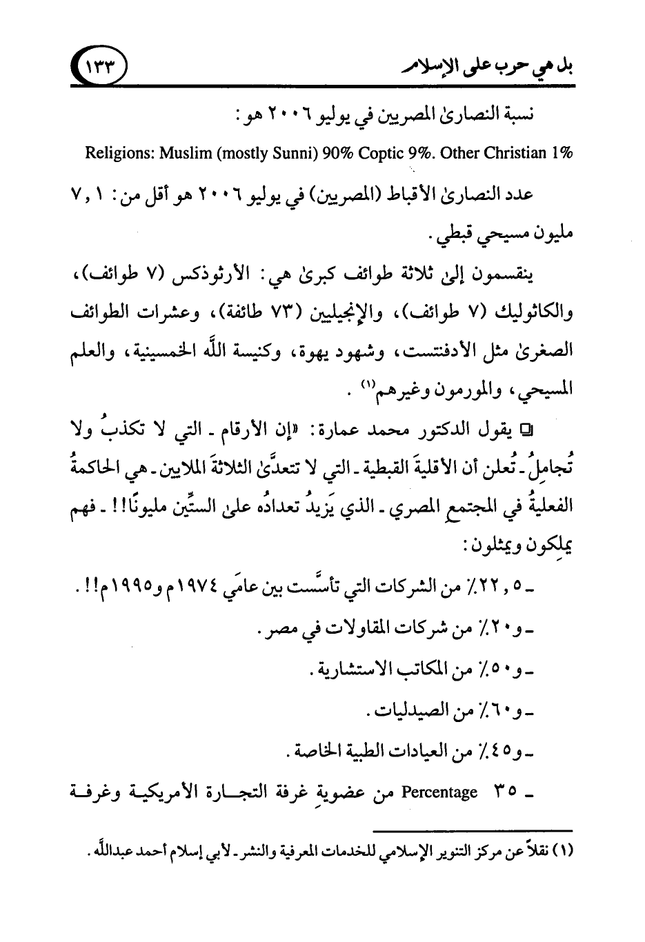 ° يقول الدكتور محمد عمارة:" إن الأرقام -التي لا تكذبُ ولا تُجامِلُ- تُعلن أن الأقليةَ القبطية -التي لا تتعدَّى الثلاثةَ الملايين- هي الحاكمةُ الفعليةُ في المجتمع المصري -الذي يَزيدُ تعدادُه على الستين مليونًا!! - فهم يملِكون ويمثلون: