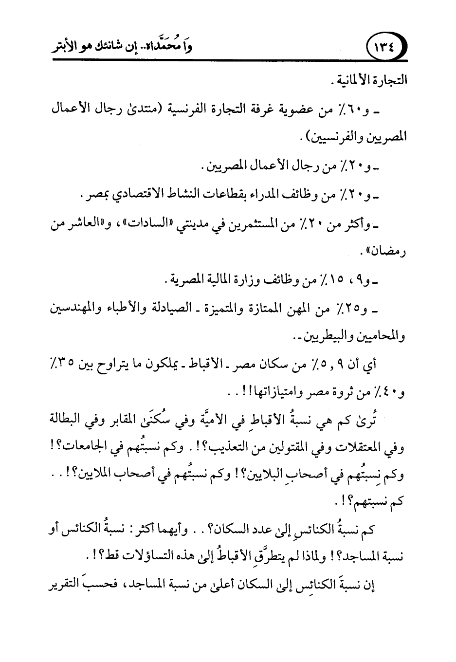 تُرى كم هي نسبةُ الأقباطِ في الأميَّة وفي سُكنَى المقابر وفي البطالة وفي المعتقلات وفي المقتولين من التعذيب؟!. وكم نسبتُهم في الجامعات؟! وكم نِسبتُهم في أصحابِ البلايين؟! وكم نسبتُهم في أصحاب الملايين؟! .. كم نسبتهم؟!.
