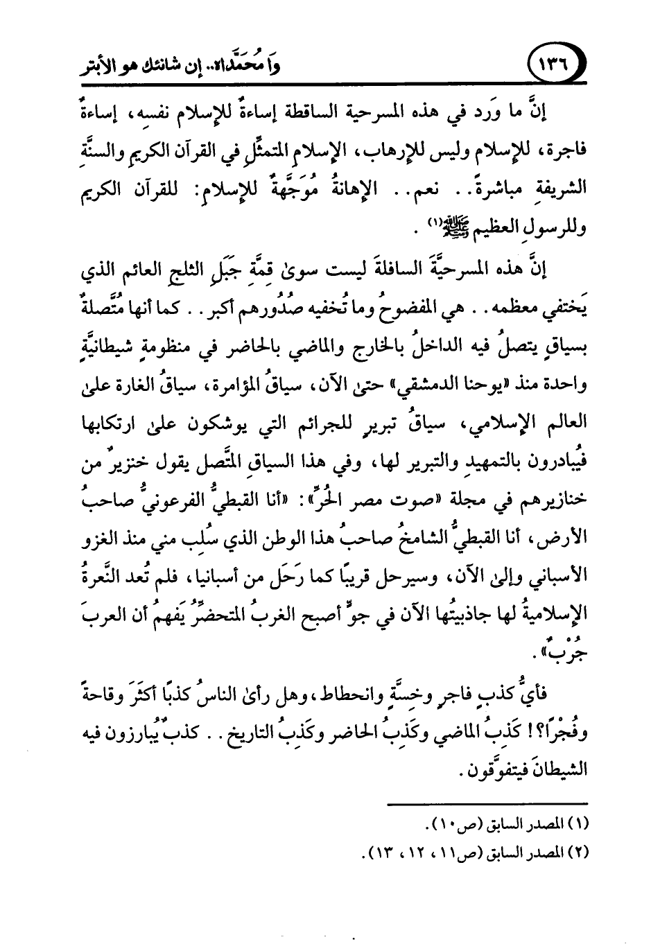 إن ما وَرد في هذه المسرحية الساقطة إساءةٌ للإسلام نفسِه، إساءةٌ فاجرة، للإسلام وليس للإرهاب، الإسلامِ المتمثل في القرآن الكريم والسنةِ الشريفةِ مباشرةً .. نعم .. الإهانةُ مُوَجَّهةٌ للإسلامِ: للقرآن الكريم وللرسولِ العظيم - صلى الله عليه وسلم - (¬1).