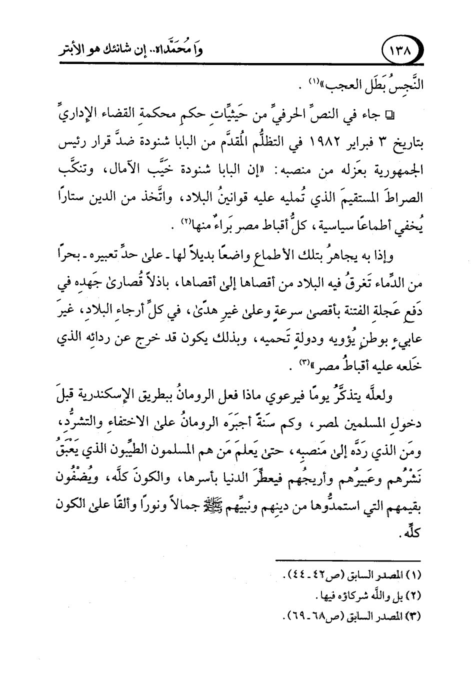 ° جاء في النص الحرفيِّ من حَيثيِّاتِ حكم محكمةِ القضاء الإِداريِّ بتاريخ 3 فبراير 1982 في التظلُّم المُقدَّم من البابا شنودة ضد قرار رئيس الجمهورية بعَزله من منصبه: "إن البابا شنودة خَيَّب الآمال، وتنكَّب الصراطَ المستقيمَ الذي تُمليه عليه قوانينُ البلاد، واتَّخذ من الدين ستارًا يُخفي أطماعًا سياسية، كلُّ أقباط مصر بَراءٌ منها (¬2).