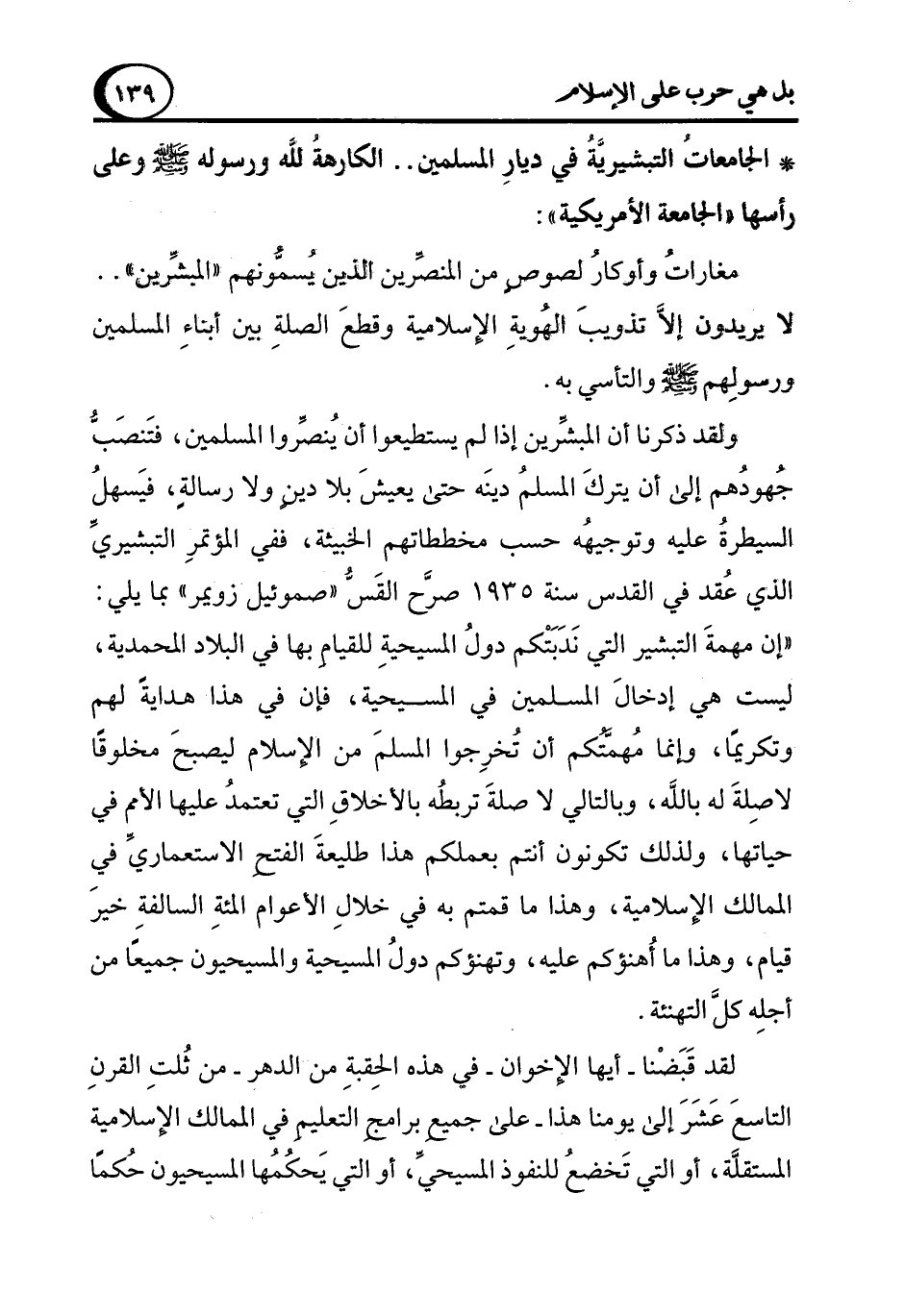 ولقد ذكرنا أن المبشِّرين إذا لم يستطيعوا أن يُنصِّروا المسلمين، فتَنصَبُّ جهودُهم إلى أن يتركَ المسلم دينَه حتى يعيشَ بلا دين ولا رسالةٍ، فيَسهل السيطرةُ عليه وتوجيهُه حسب مخططاتهم الخبيثة، ففي المؤتمرِ التبشيريِّ الذي عُقد في القدس سنة 1935 صرَّح القَسُّ "صموئيل زويمر" بما يلي: "إن مهمةَ التبشير التي نَدَبَتْكم دولُ المسيحيةِ للقياِم بها في البلاد المحمدية، ليست هي إدخالَ المسلمين في المسيحية، فإن في هذا هدايةً لهم وتكريمًا، وإنما مهمَّتُكم أن تخرِجوا المسلمَ من الإسلام ليصبحَ مخلوقًا لا صِلةَ له بالله، وبالتالي لا صلةَ تربطه بالأخلاقِ التي تعتمد عليها الأمم في حياتها، ولذلك تكونون أنتم بعملكم هذا طليعةَ الفتح الاستعماريِّ في الممالك الإسلامية، وهذا ما قمتم به في خلالِ الأعوام المئةِ السالفةِ خيرَ قيام، وهذا ما أُهنؤكم عليه، وتهنؤكم دولُ المسيحية والمسيحيون جميعًا من أجلِه كلَّ التهنئة.